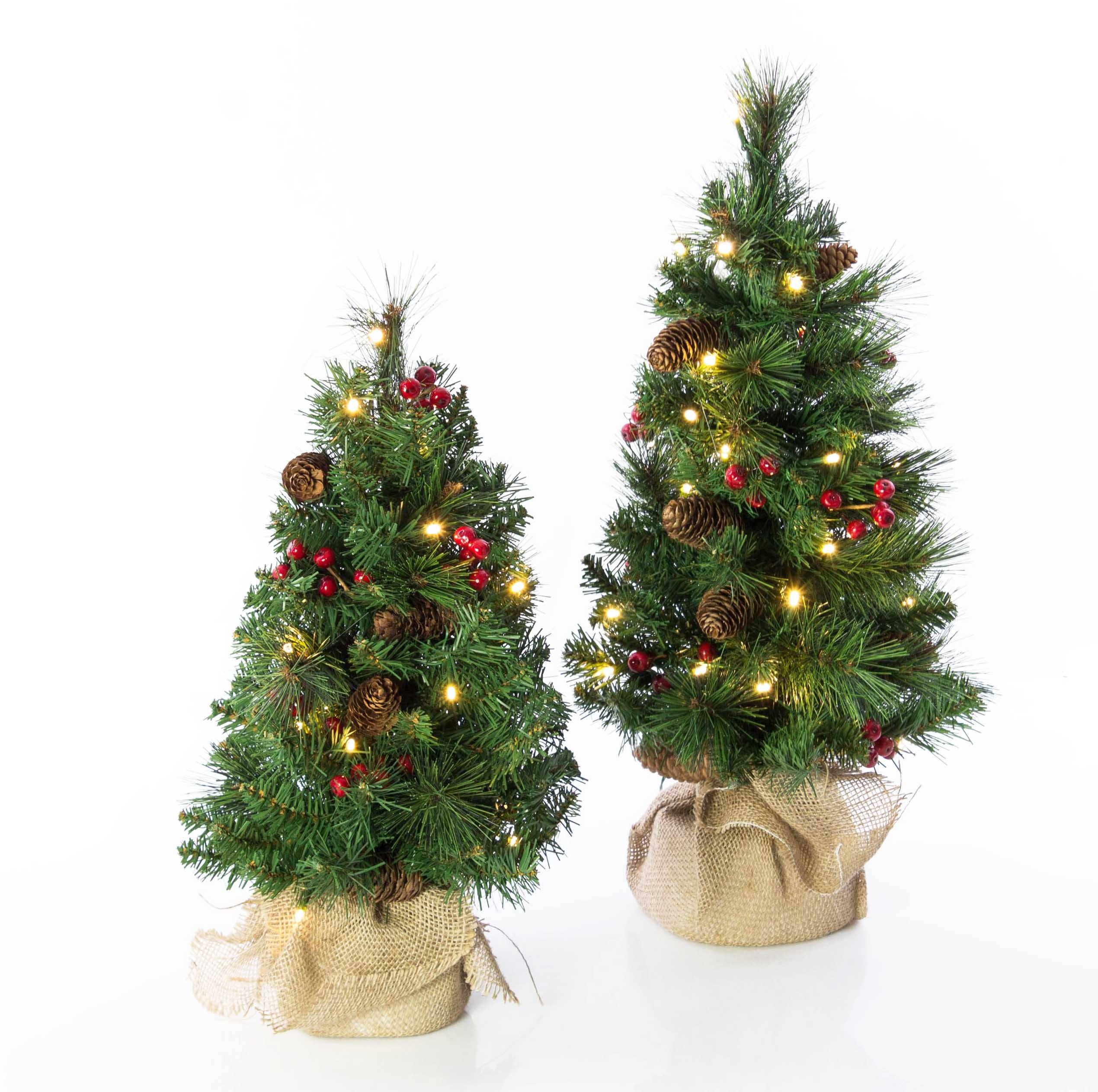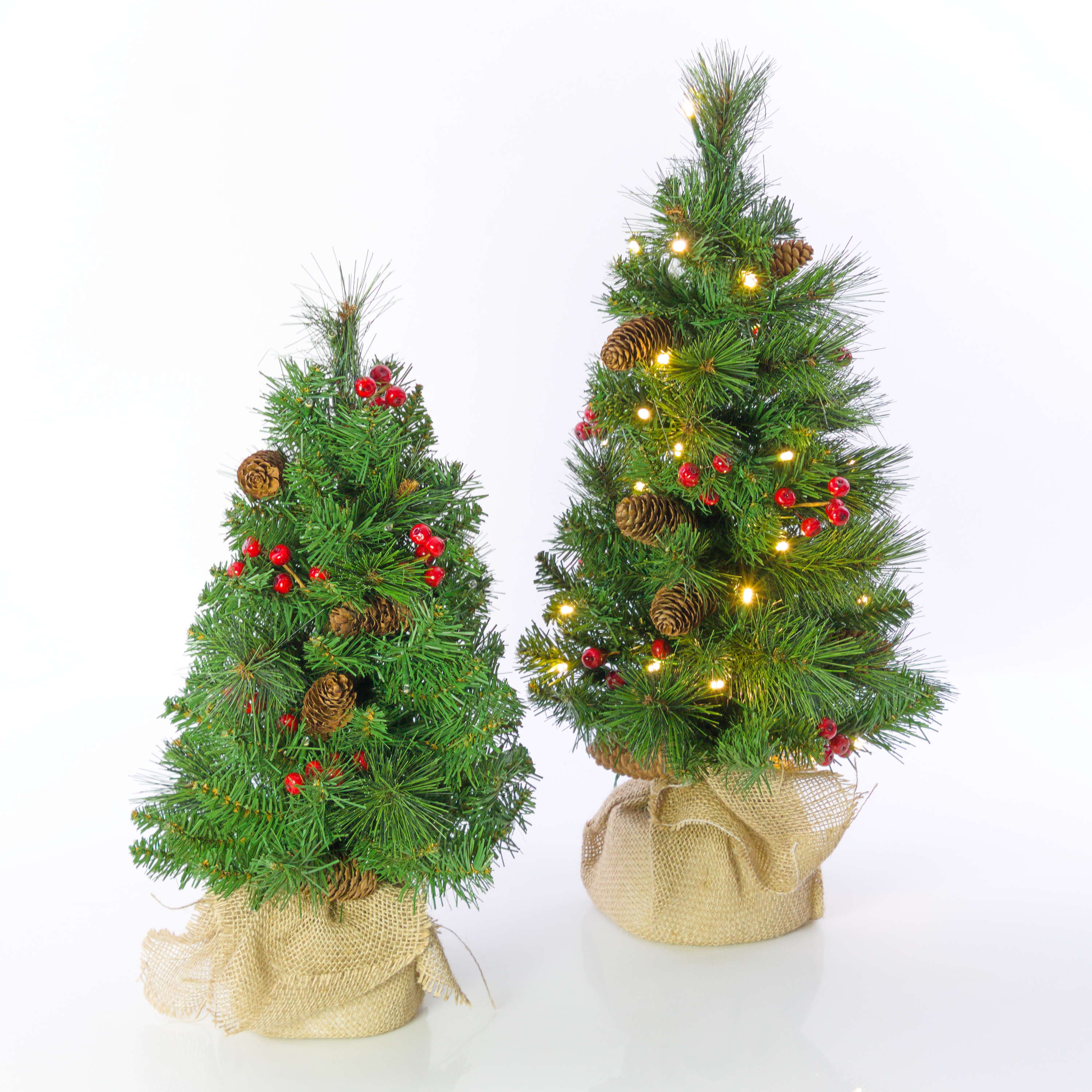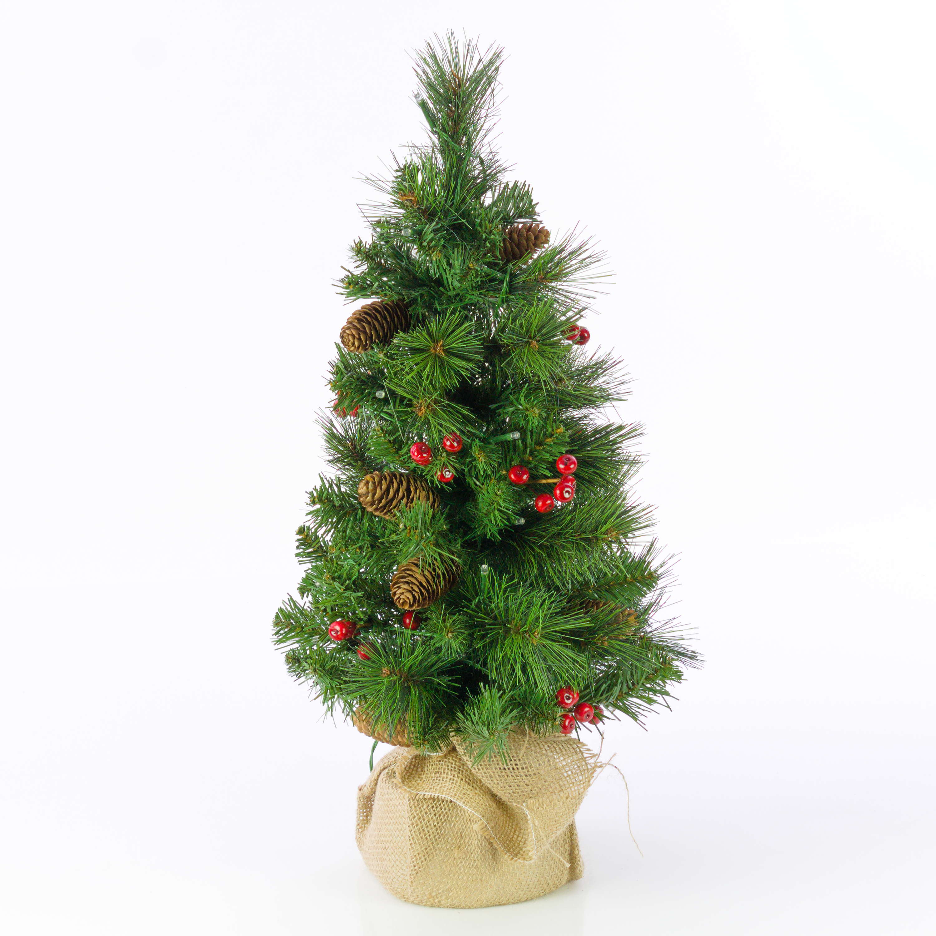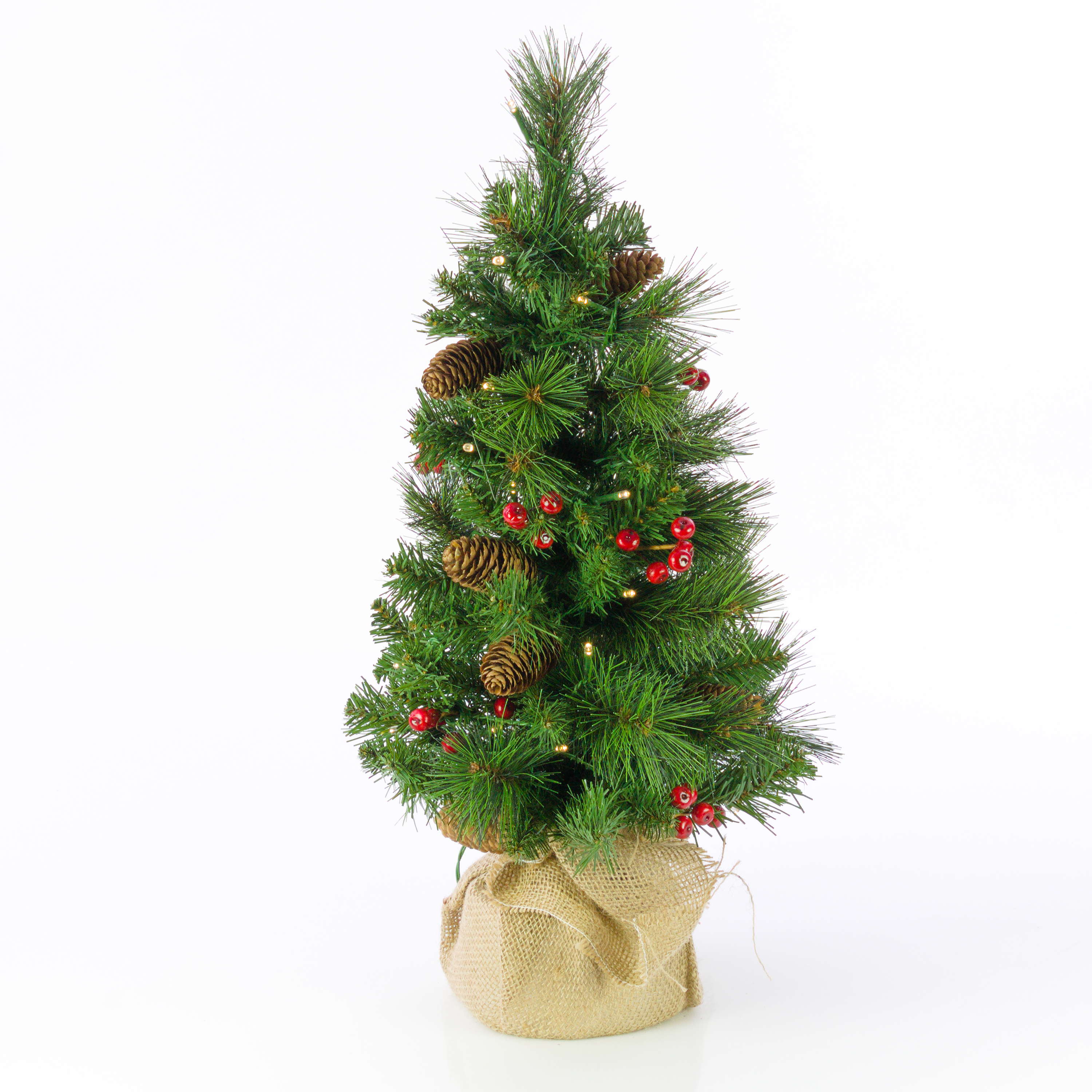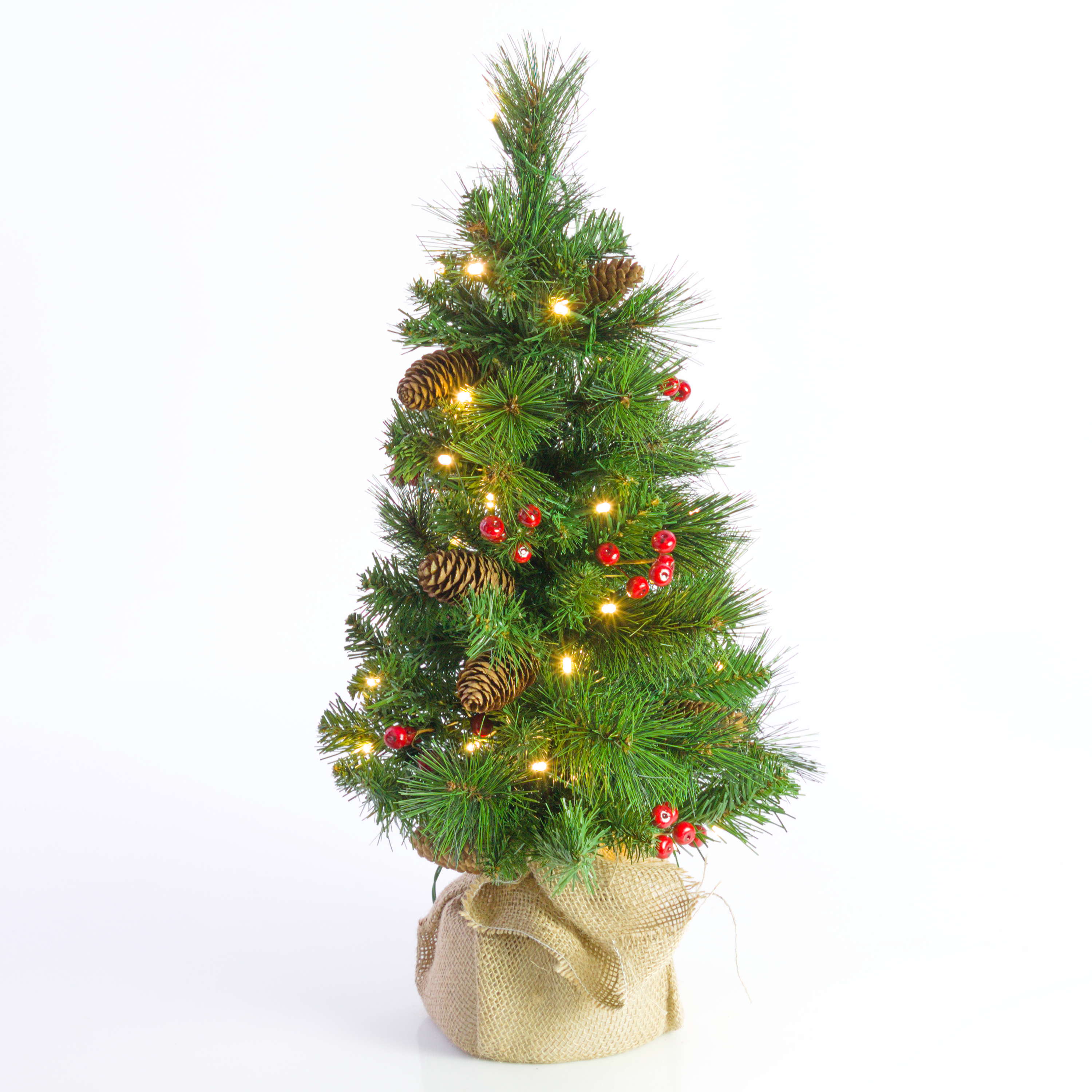Umělá jedle BUKAREST, se šiškami, jutový pytel, ozdobený, LED diody, 60cm, Ø35cm