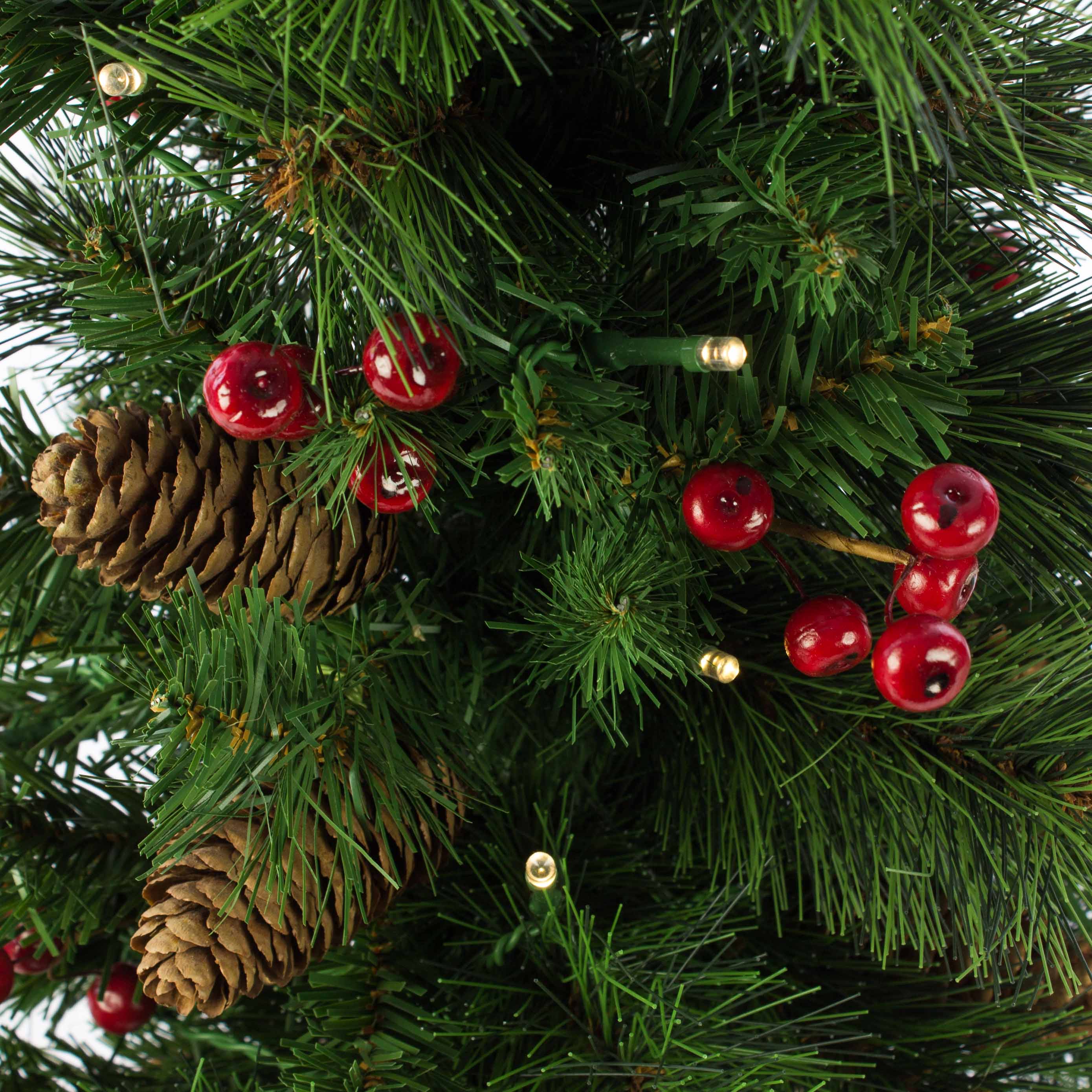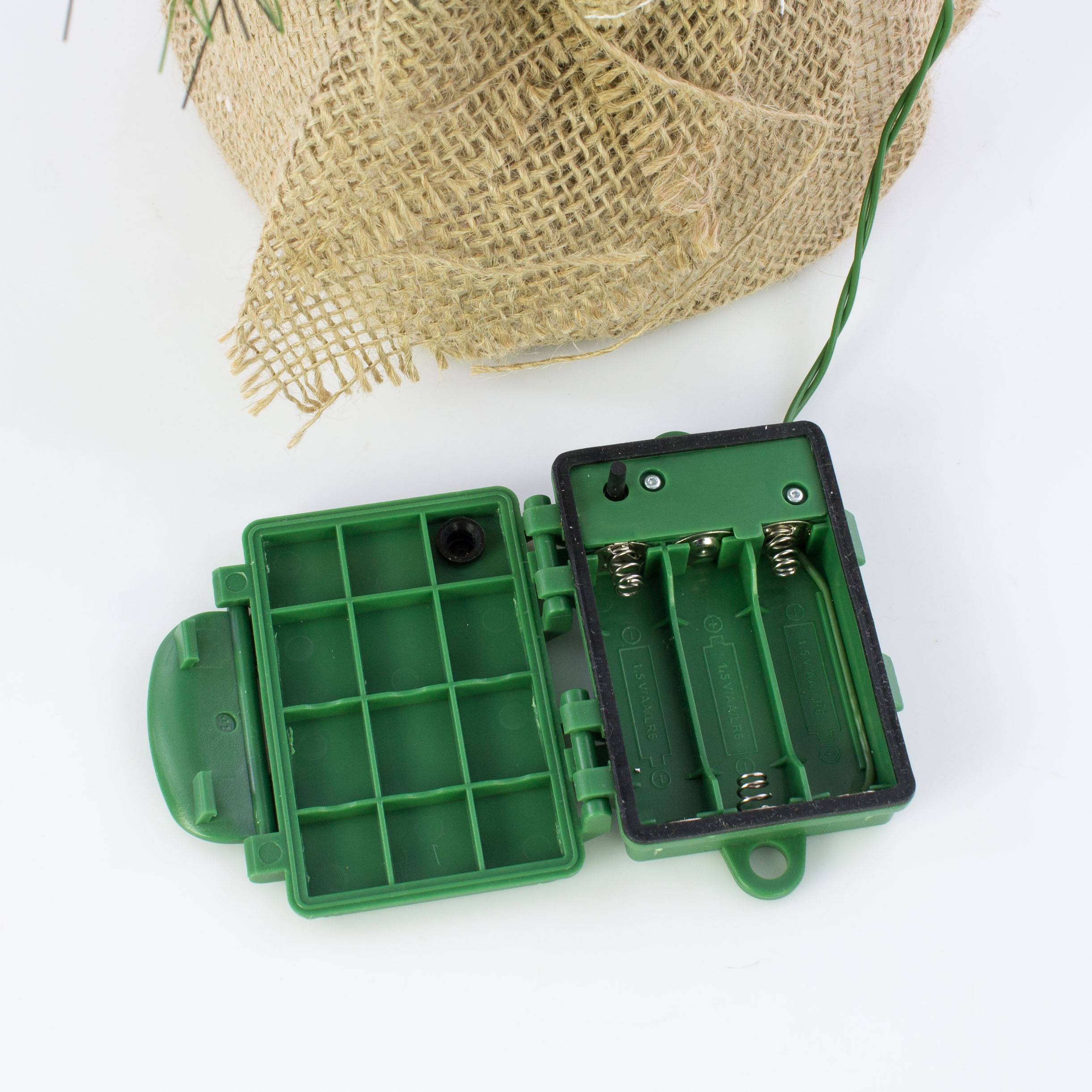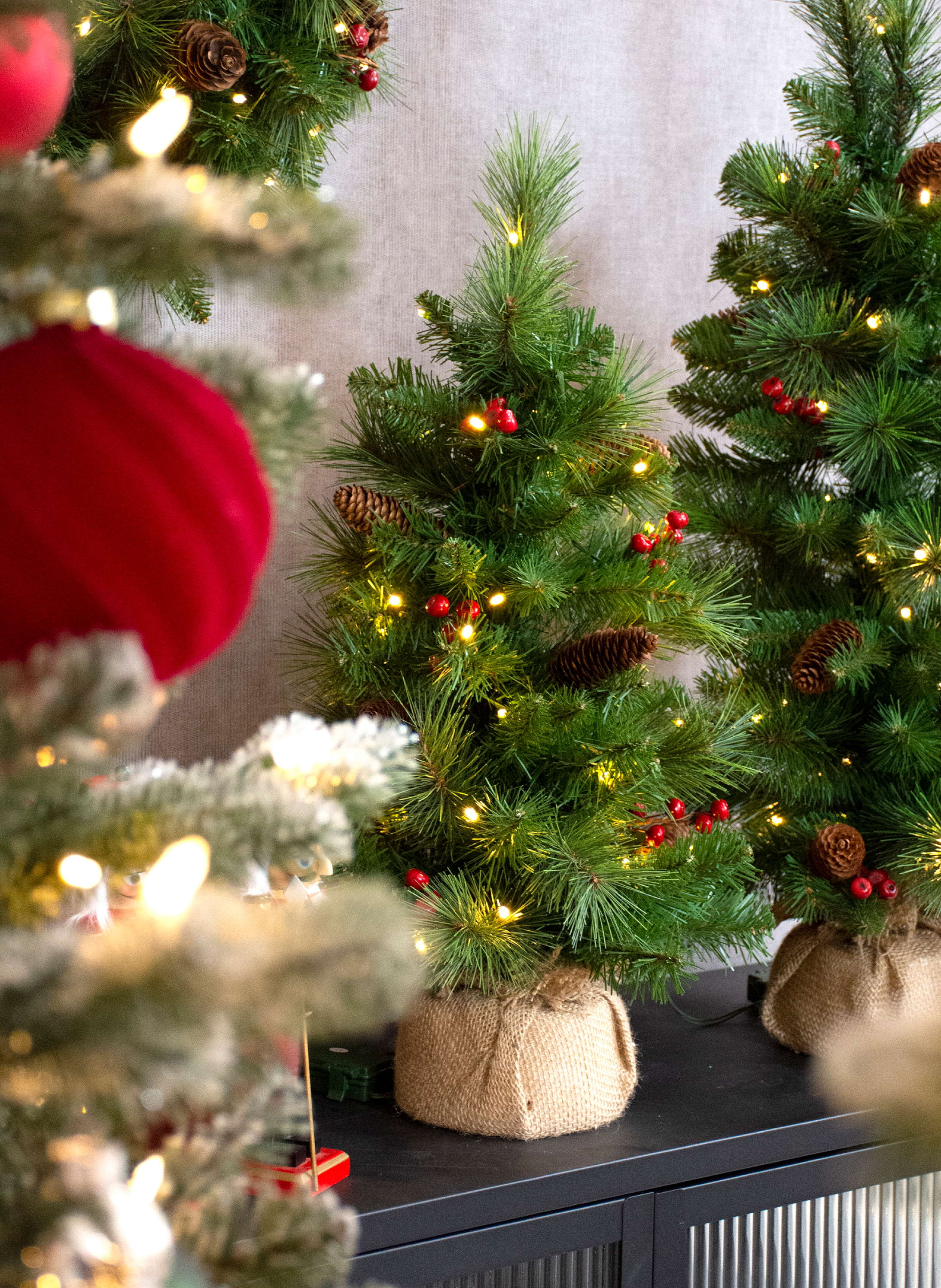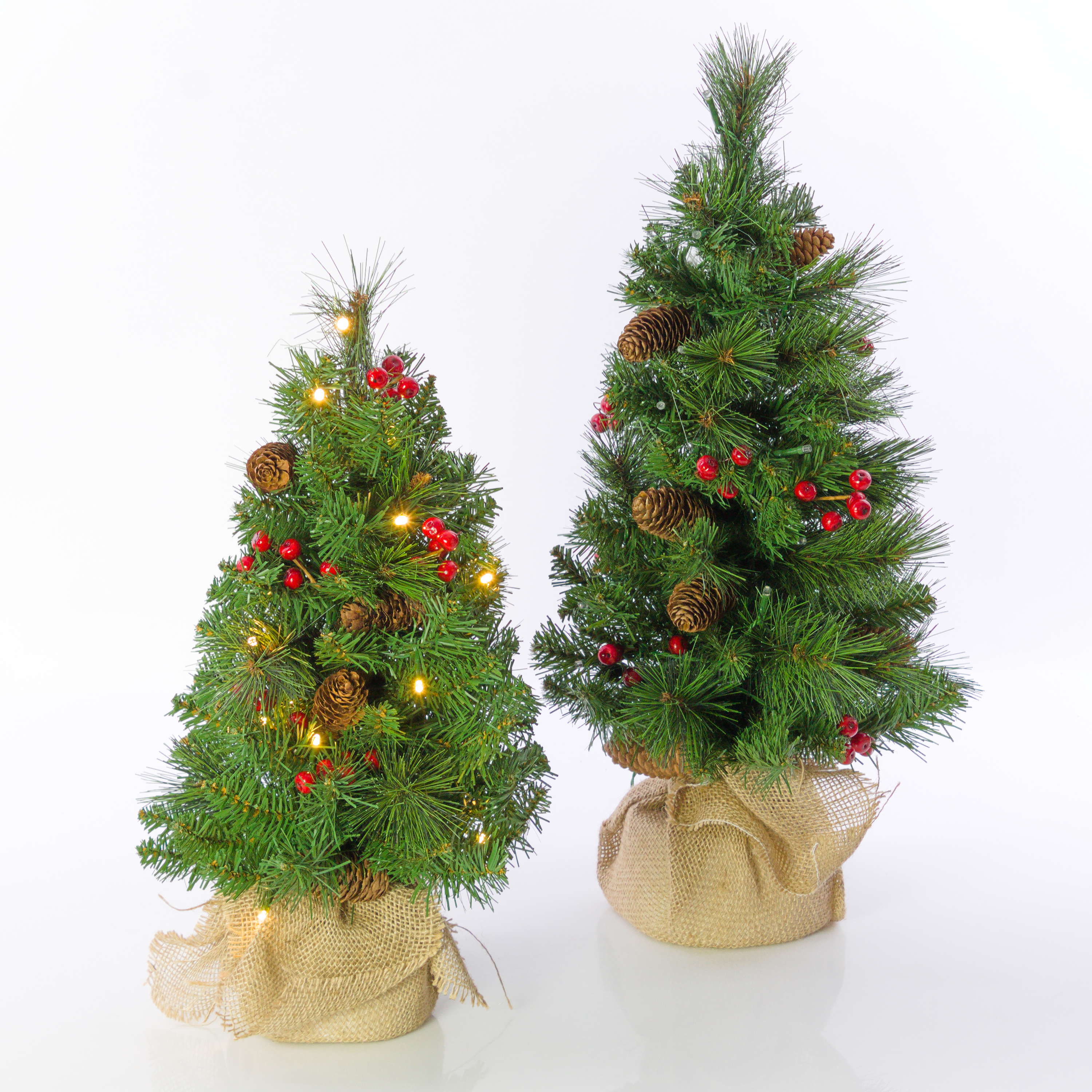 Umělá jedle BUKAREST, se šiškami, jutový pytel, ozdobený, LED diody, 60cm, Ø35cm