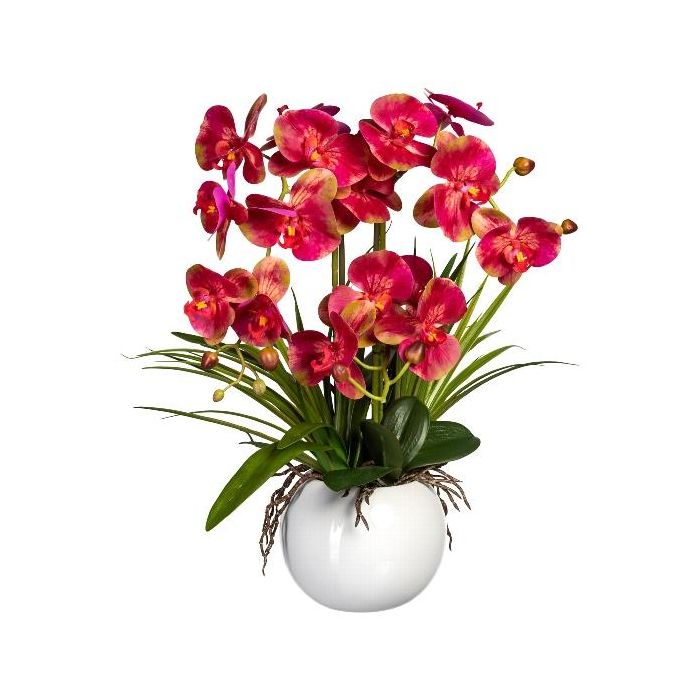Umělá květina aranžmá Orchidej Phalaenopsis TRALFEN s trávou, keramický květináč, kořeny, růžovo-zelená, 60cm