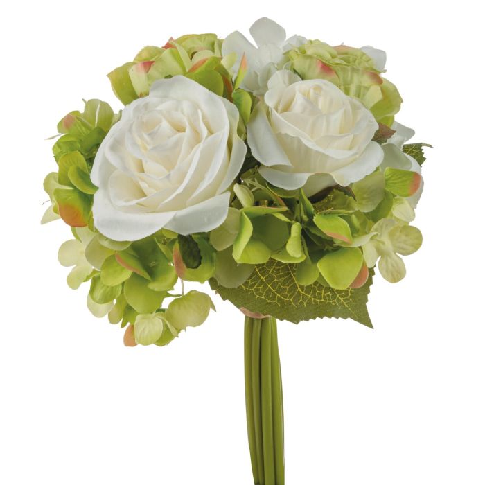 Umělá kytice FOUDILA, růže, hortenzie, krémově zelená, 25cm