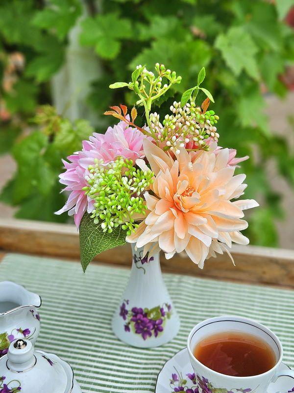Umělá kytice jiřin SAHNY se sněhovou koulí, růžovo-meruňková, 27cm