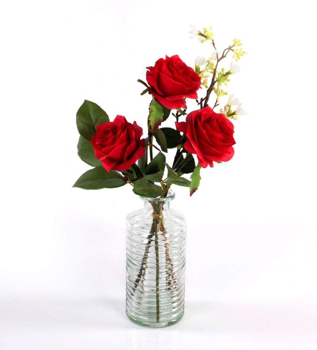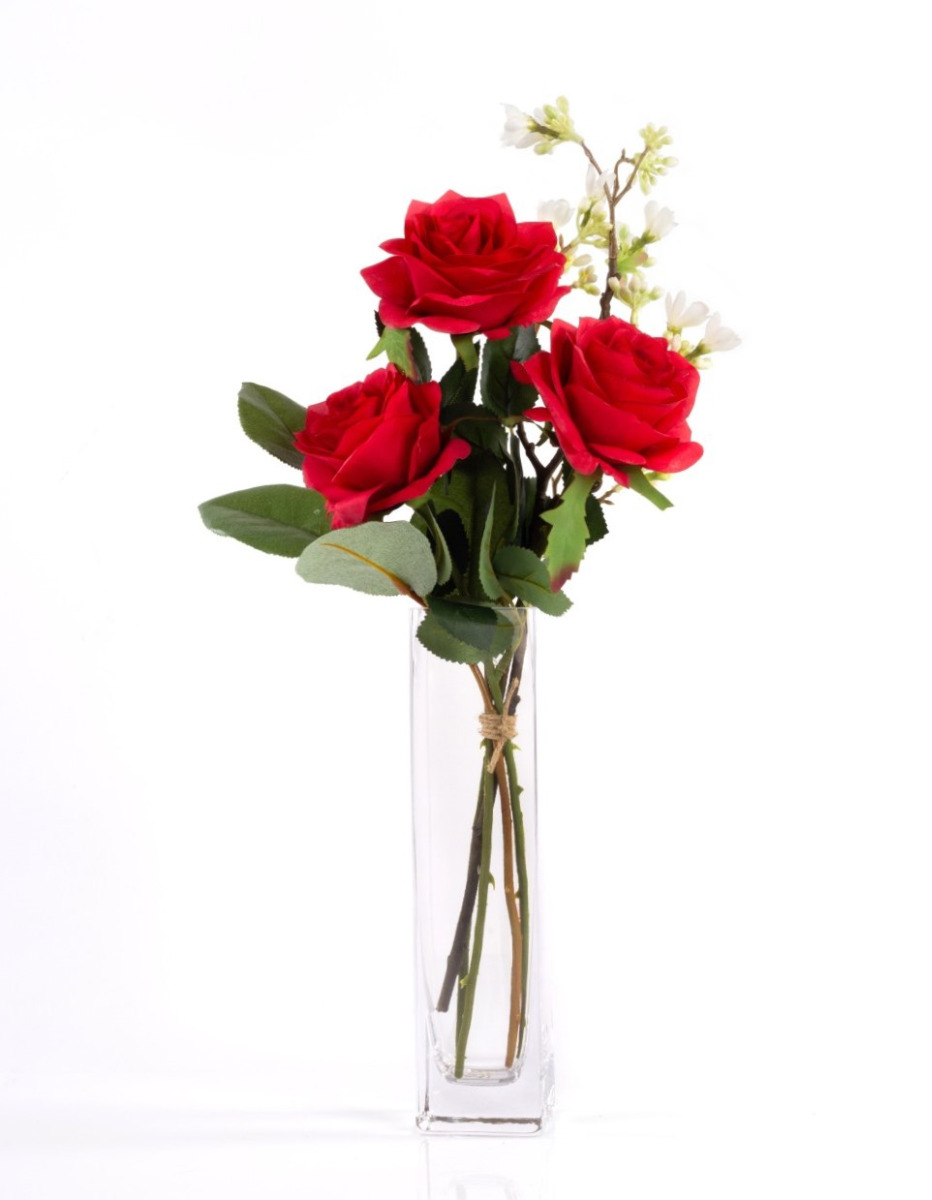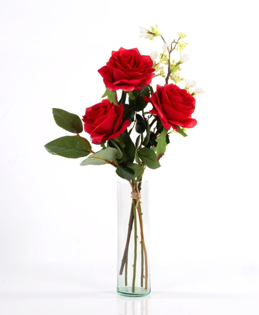 Handgebundener kleiner Rosen Strauß SIMONY aus 3 roten Rosen. Das künstliche Arrangement wird von der Blume Sieben Söhne des Himmels umspielt und durch frisches Grün des Apfelblattzweiges ergänzt. Der Kunst Blumenstrauß dekoriert Ihre Tischvase zu verschiedenen Tafel Anlässen wie z.B. Valentinstag, Jahrestag oder als Beigabe zu einem Geburtstagsgeschenk, uvm.