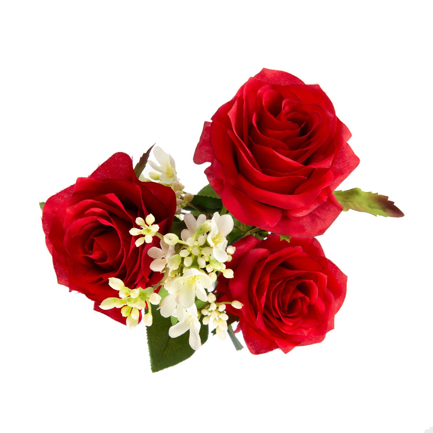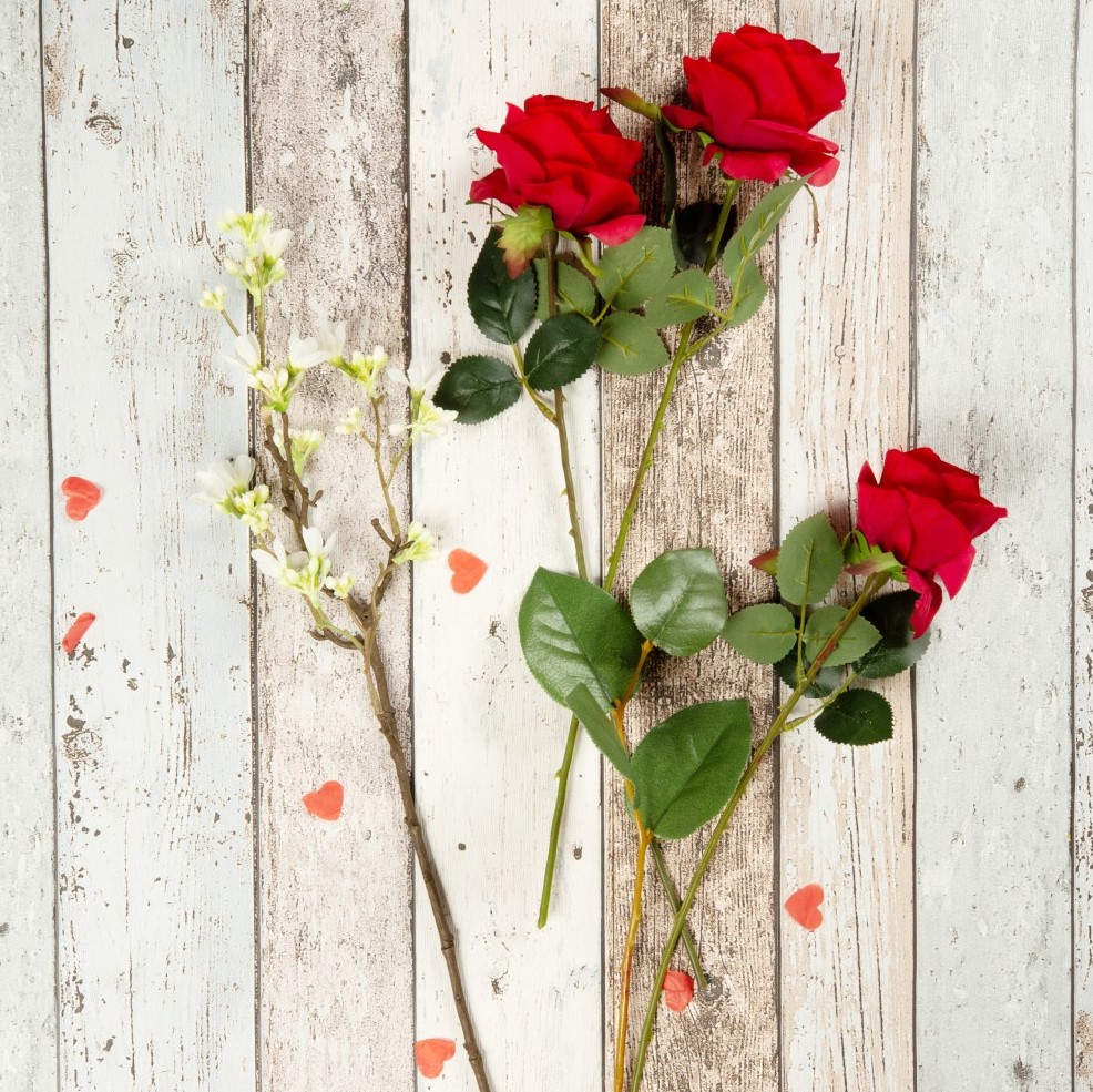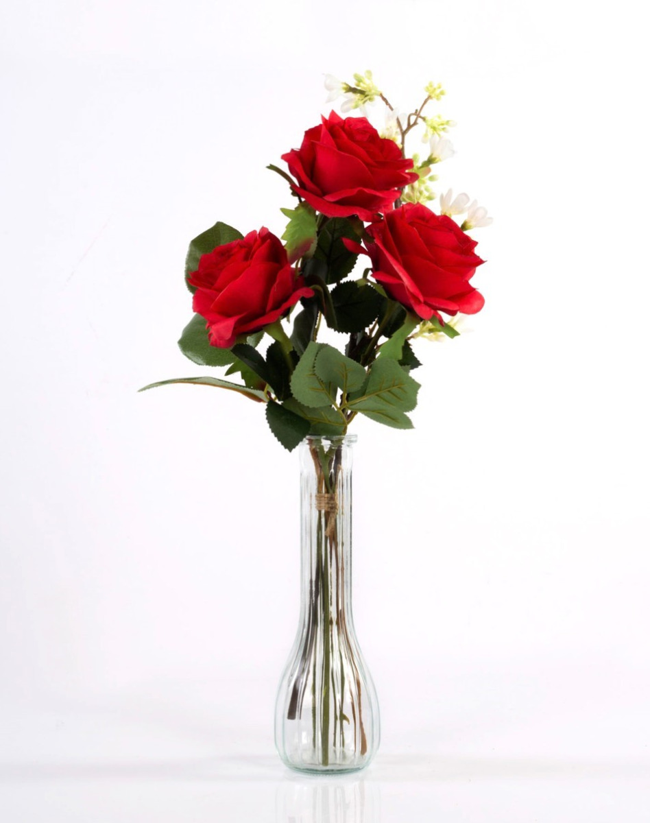 Handgebundener kleiner Rosen Strauß SIMONY aus 3 roten Rosen. Das künstliche Arrangement wird von der Blume Sieben Söhne des Himmels umspielt und durch frisches Grün des Apfelblattzweiges ergänzt. Der Kunst Blumenstrauß dekoriert Ihre Tischvase zu verschiedenen Tafel Anlässen wie z.B. Valentinstag, Jahrestag oder als Beigabe zu einem Geburtstagsgeschenk, uvm.