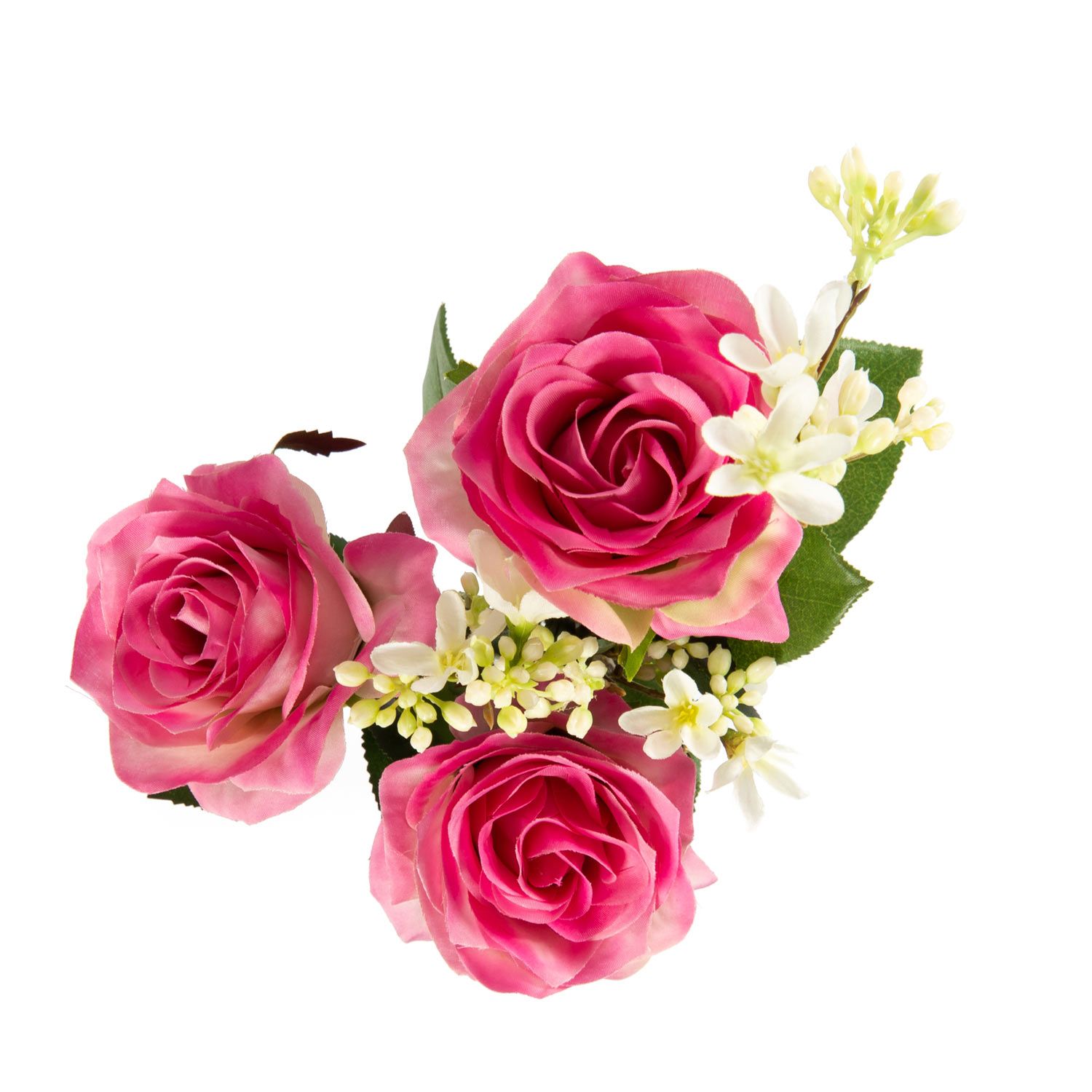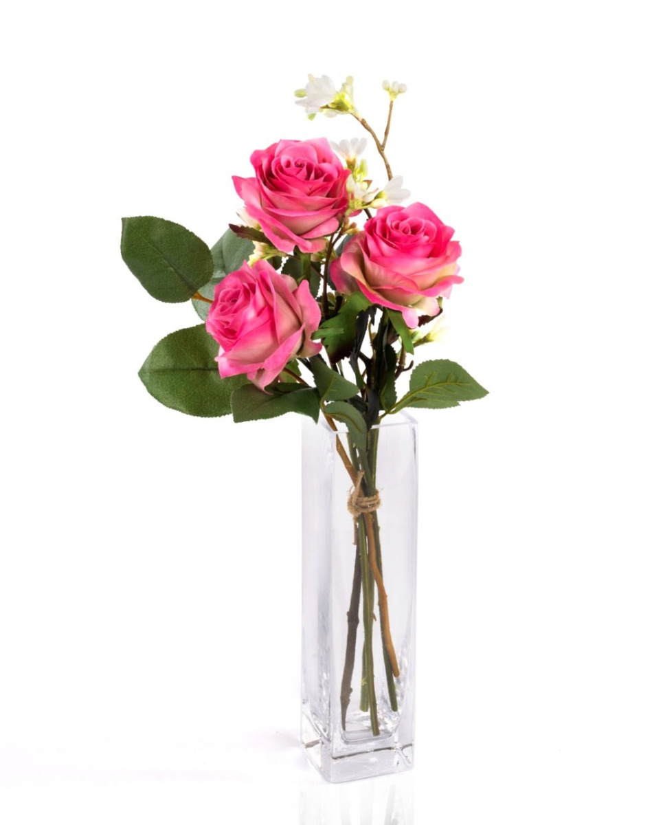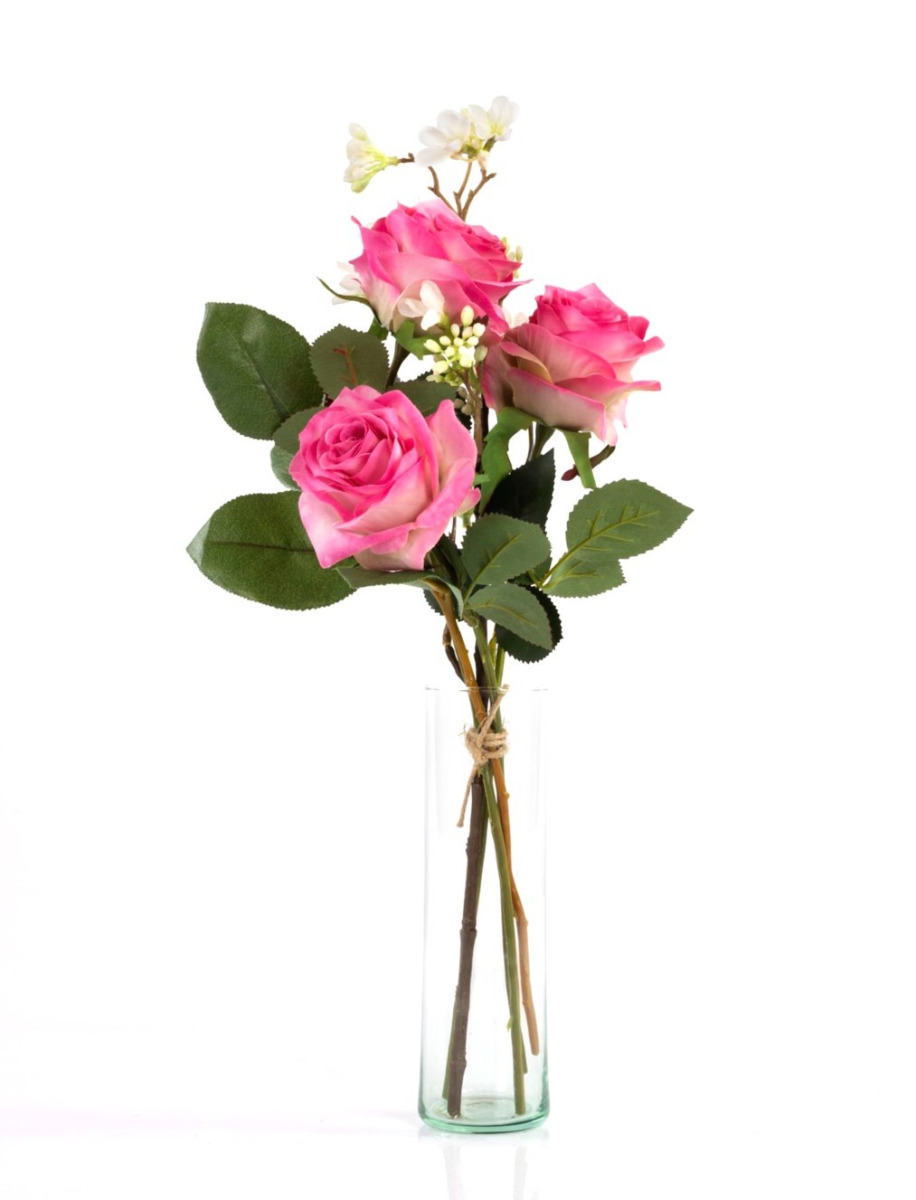 Handgebundener kleiner Rosen Strauß SIMONY aus 3 rosa-pink farbigen Rosen. Das künstliche Arrangement wird von der Blume Sieben Söhne des Himmels umspielt und durch frisches Grün des Apfelblattzweiges ergänzt. Der Kunst Blumenstrauß dekoriert Ihre Tischvase zu verschiedenen Tafel Anlässen wie z.B. Valentinstag, Jahrestag oder als Beigabe zu einem Geburtstagsgeschenk, uvm.