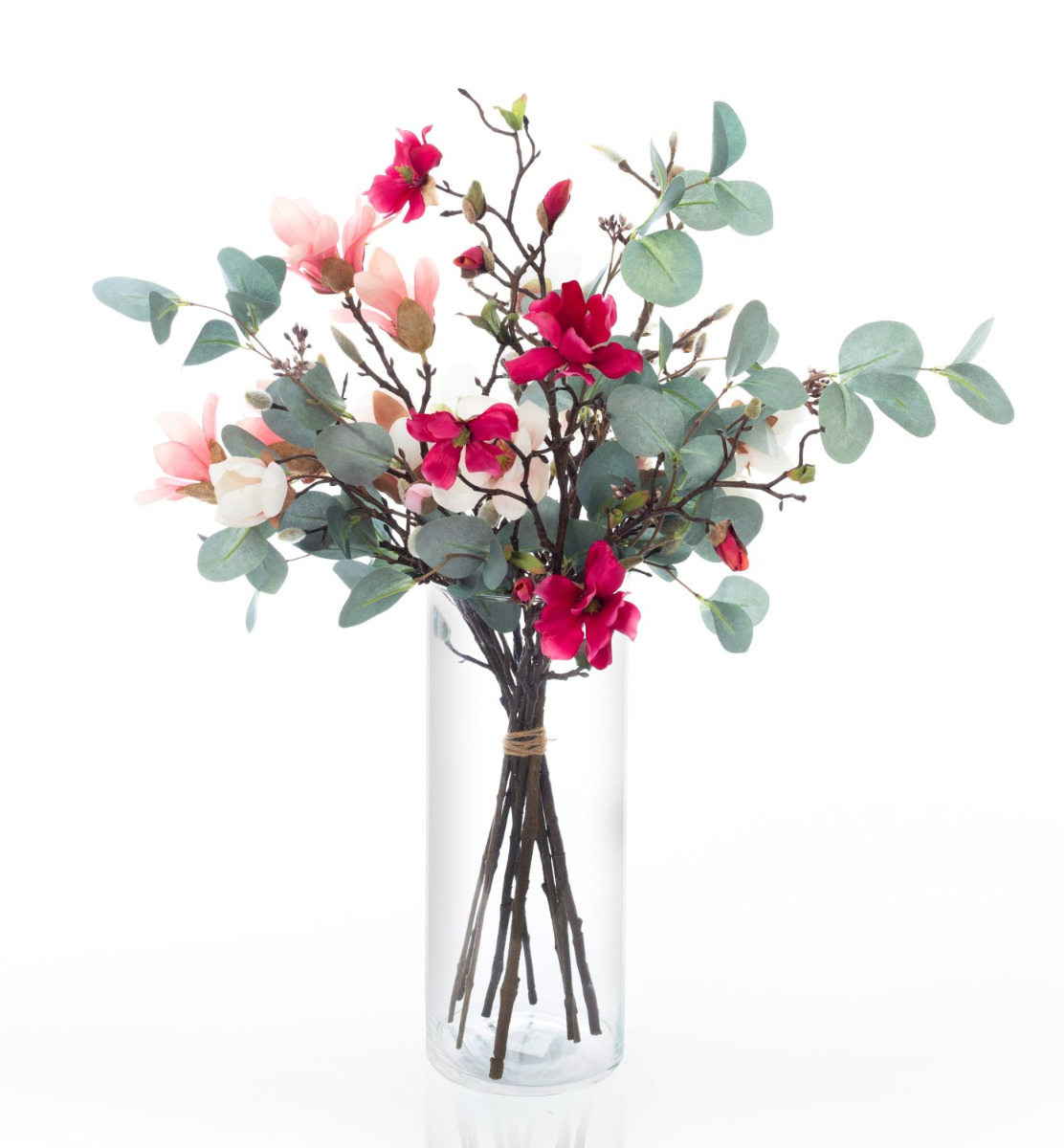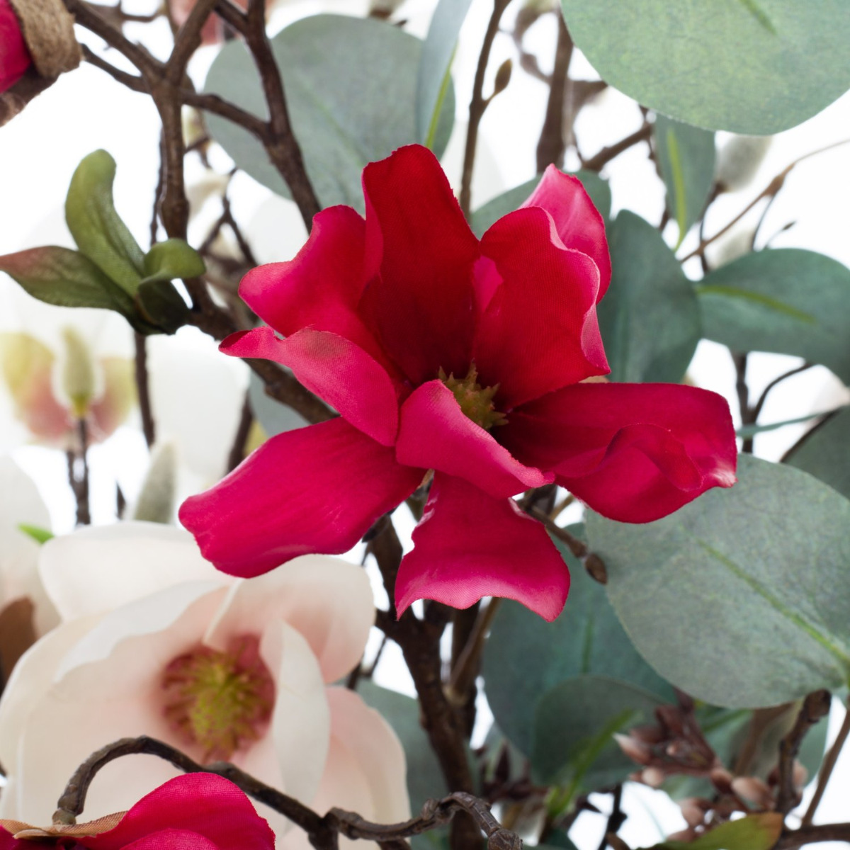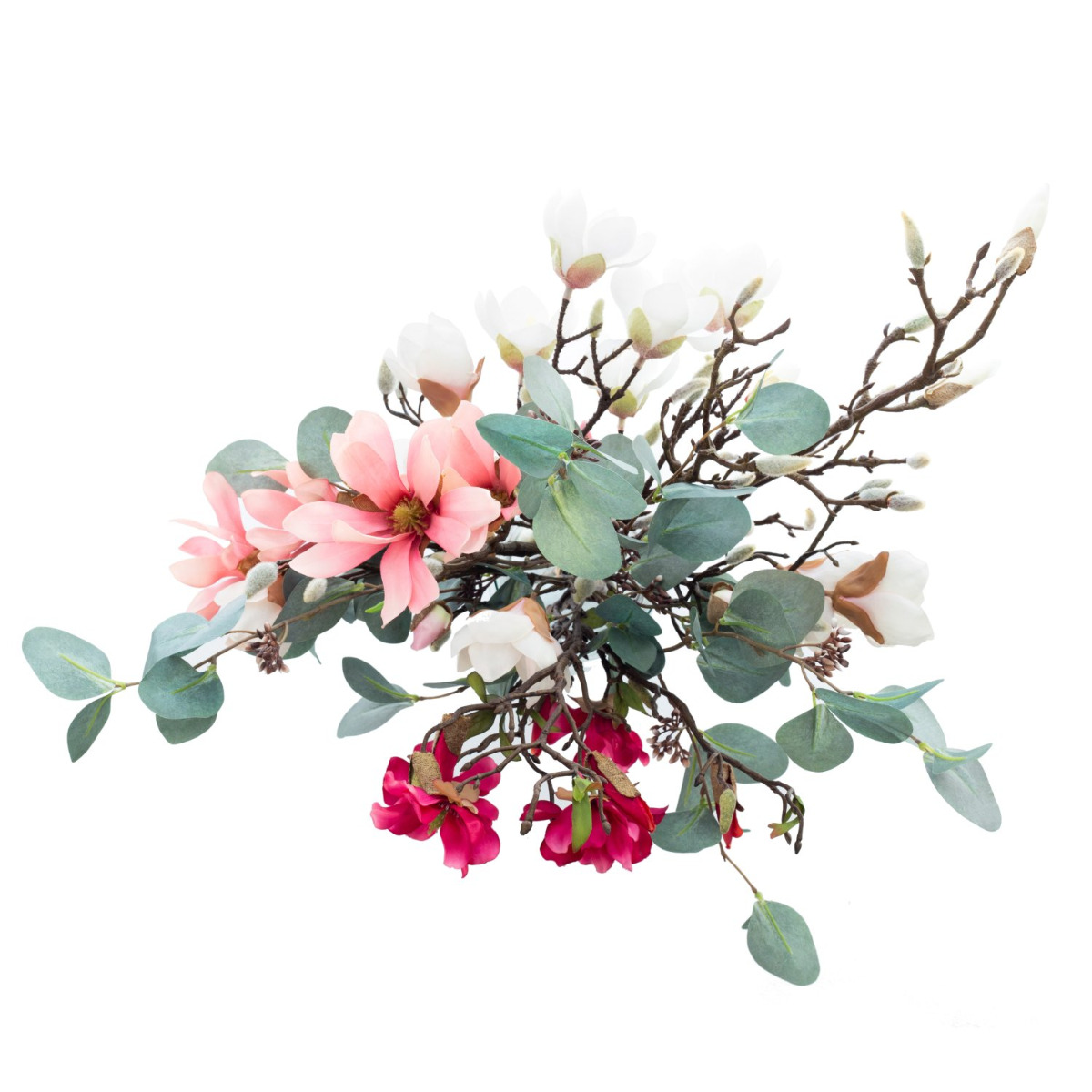 S naší kyticí magnólií MERISA obdržíte krásný jarní pozdrav. Kytice se skládá z velké poupátkové větve a různobarevných větviček magnólie a hvězdicové magnólie. Množství květů je rozčleněno velkými listy eukalyptu.