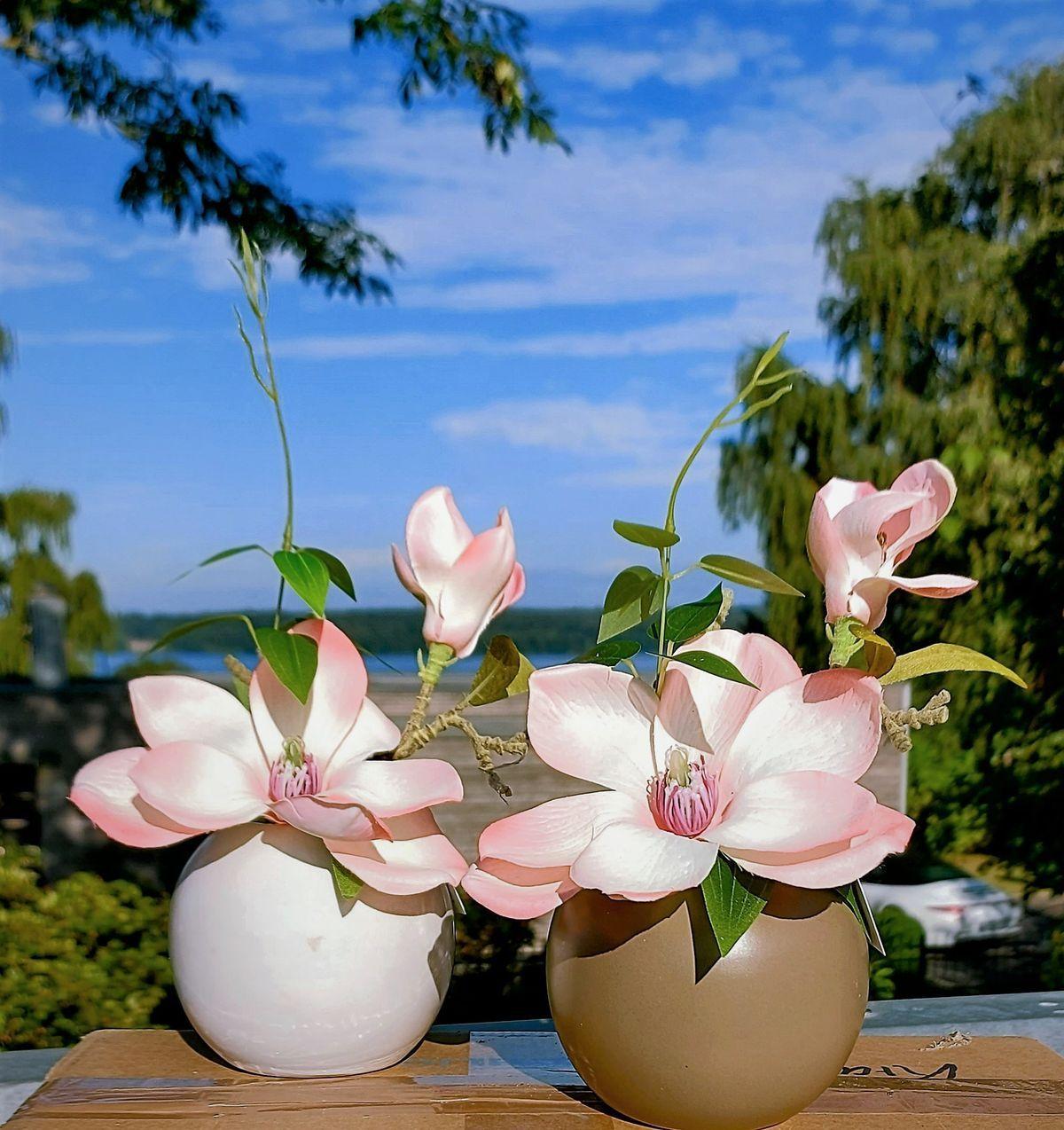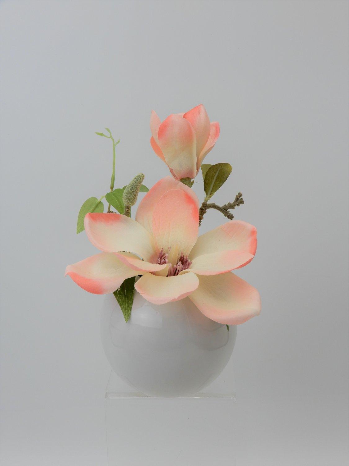 Umělá magnólie FEMI v bílém keramickém květináči, krémovo-meruňková, 20cm, Ø17cm