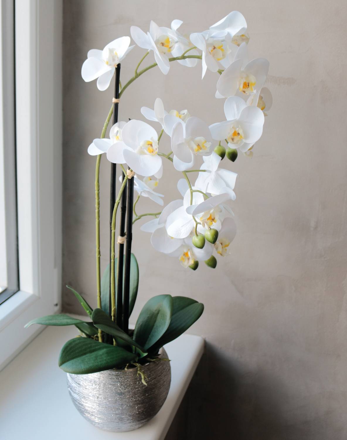 Umělá orchidej Phalaenopsis EMILIA, dekorativní hrnec, bílá, 55cm