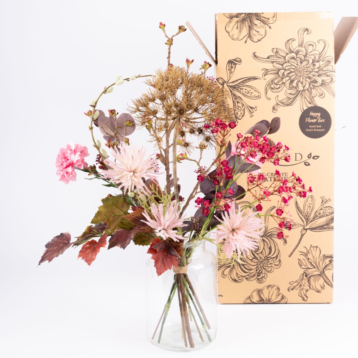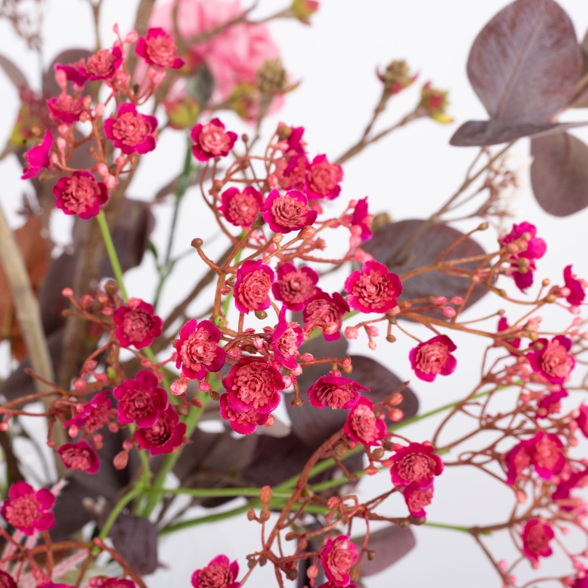 Bledě růžová a zářivě růžová. Tato kytice je nádherně barevně sladěná. Jasně růžovou barvu větvičky s květy gypsophily zvýrazňují zejména nahnědlé podzimní listy. S odstíny růžové a růžové působí tato kytice přátelsky a vykouzlí ve vašem pokoji útulnou atmosféru. Podzim může být tak krásný.