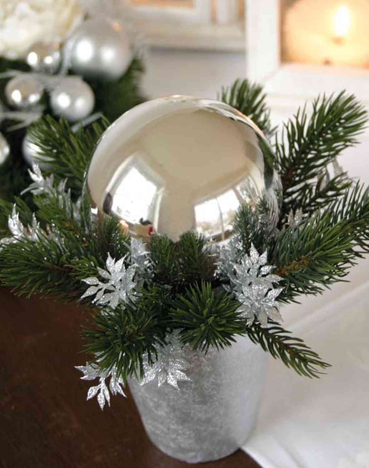 Umělé aranžmá z jedle SKELLA v dekoračním květináči, koule, stříbrná, 20cm