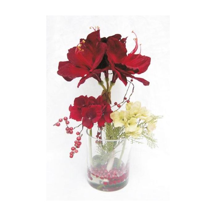 Umělé květinové aranžmá amarylis, hortenzie TASHI, dekorační sklo, červeno-krémová, 40cm, Ø23cm