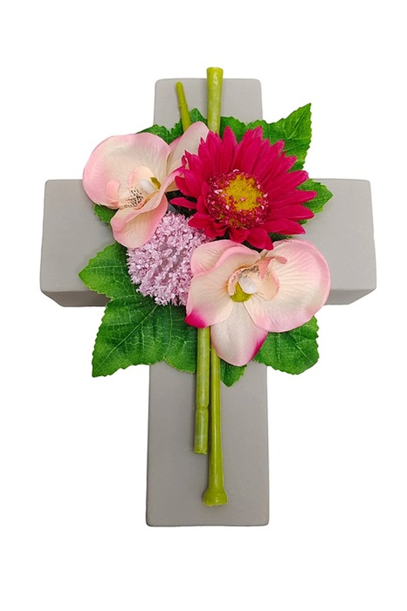 Umělé květinové aranžmá gerbera, orchidej, allium ANSGAR, výsadbový kříž, růžovo, 20x15x9cm