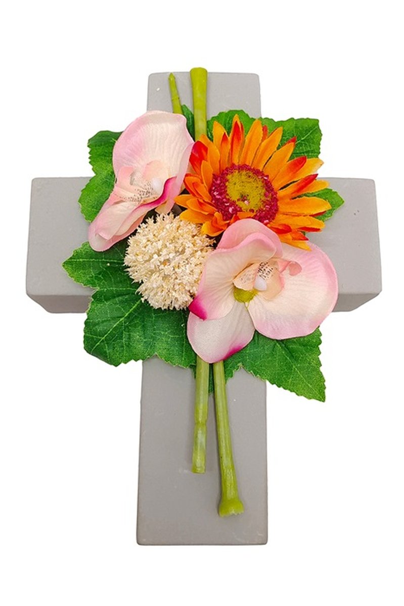 Umělé květinové aranžmá gerbera, orchidej, allium ANSGAR, výsadbový kříž, růžovo-oranžová, 20x15x9cm