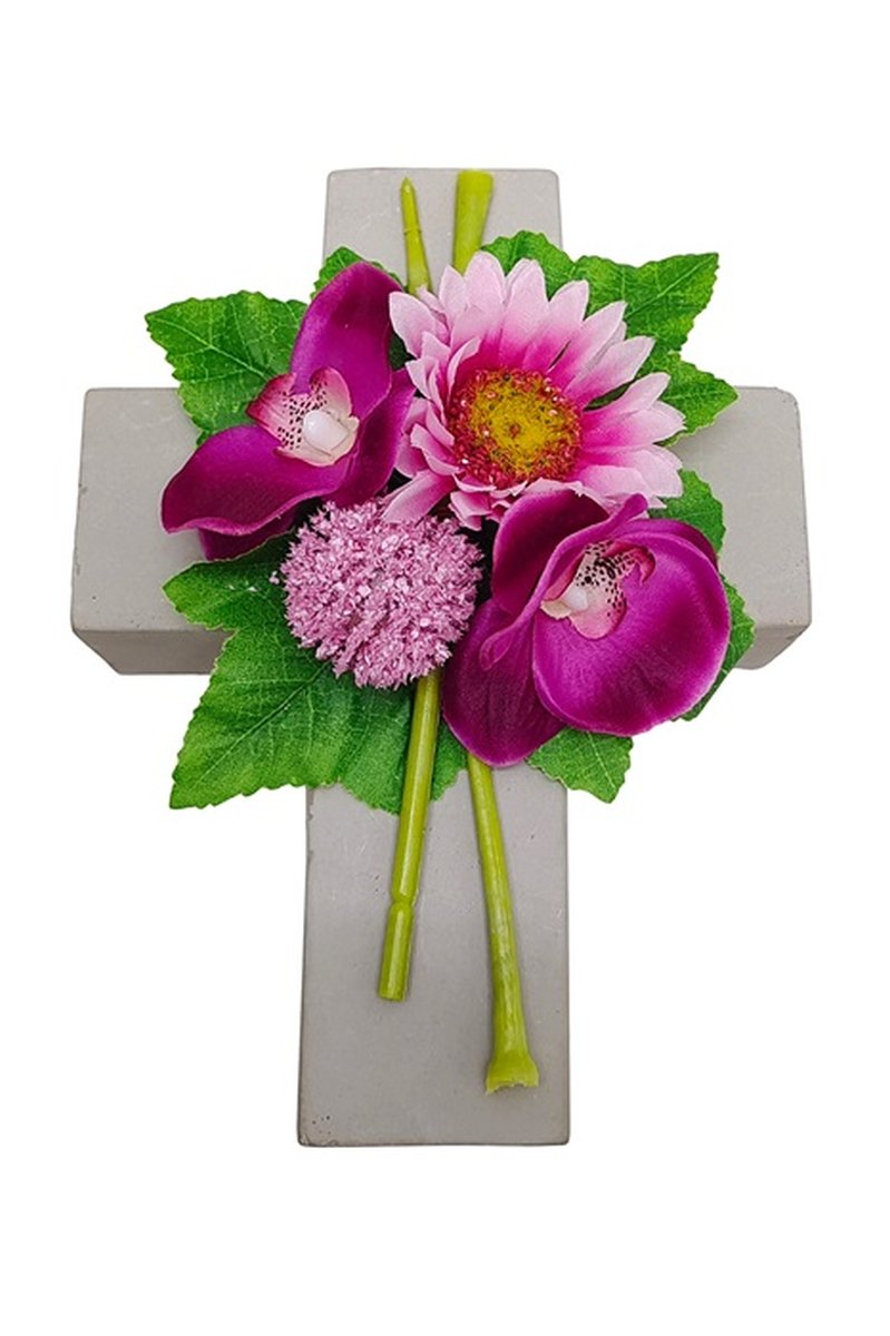 Umělé květinové aranžmá gerbera, orchidej, allium ANSGAR, výsadbový kříž, tmavě růžová, 20x15x9cm