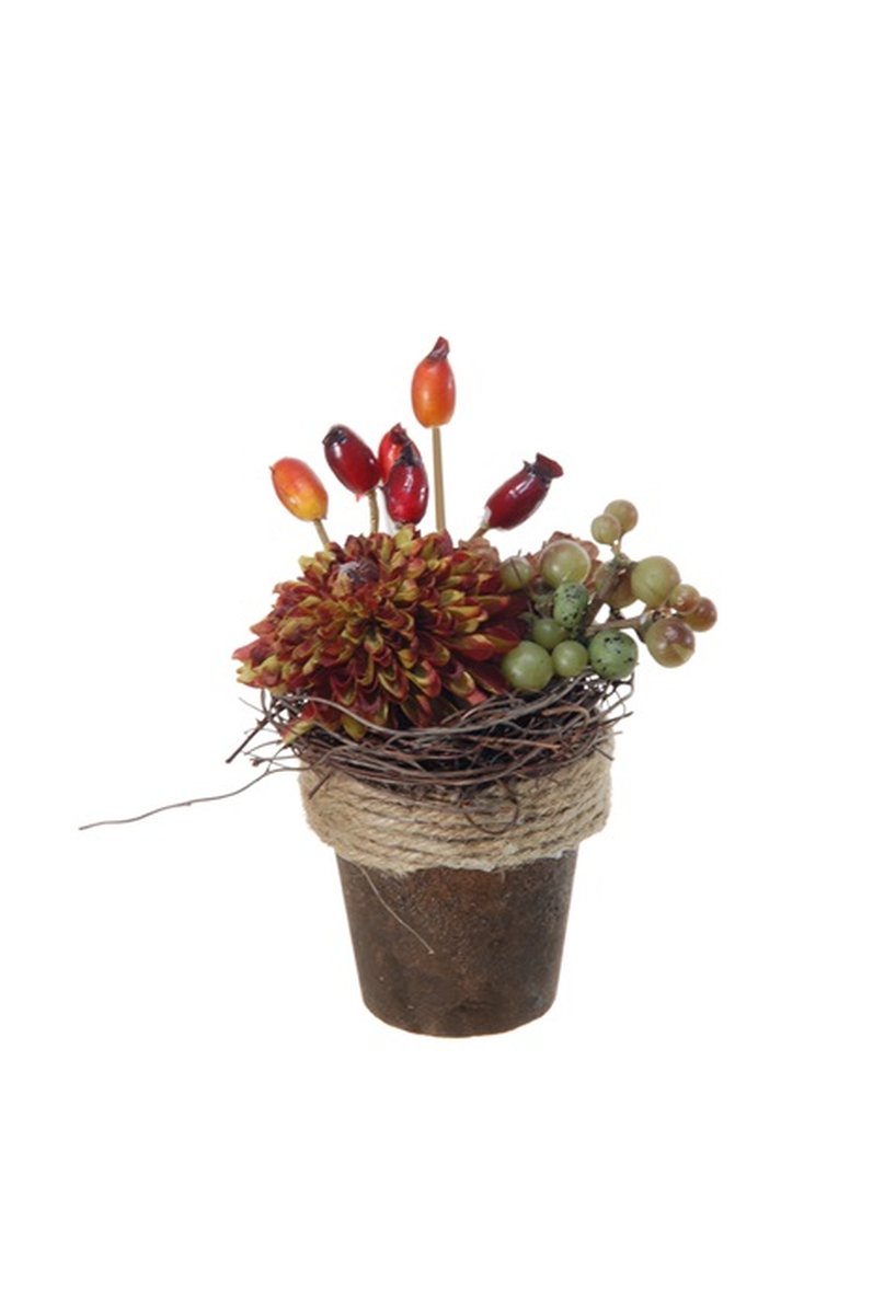 Umělé květinové aranžmá jiřina, šípky, hrozny MUSAN, dekorační květináč, červeno-oranžovo-zelená, 10cm, Ø7cm