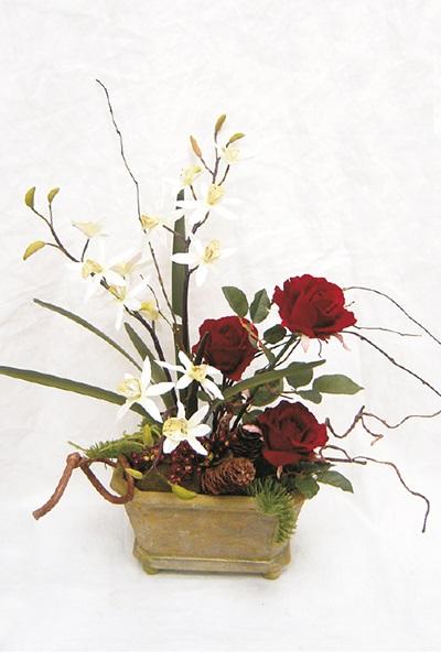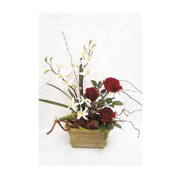 Umělé květinové aranžmá orchidej stromobytec, růže TALIMA, dekorativní květináč, červeno-bílá, 50cm, Ø40cm