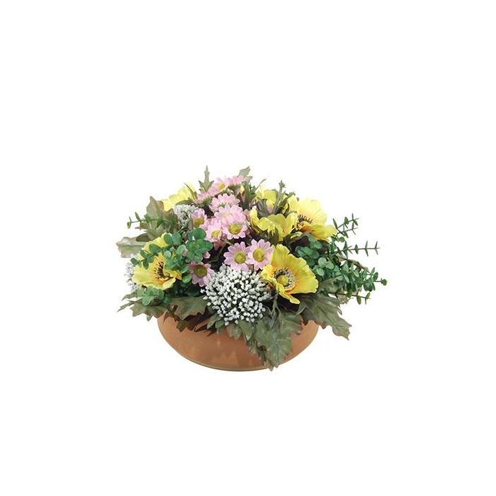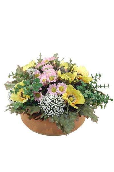 Umělé květinové aranžmá sasanka, čechrava IGNATIO na talíři, žluto-růžová, 17cm, Ø28cm