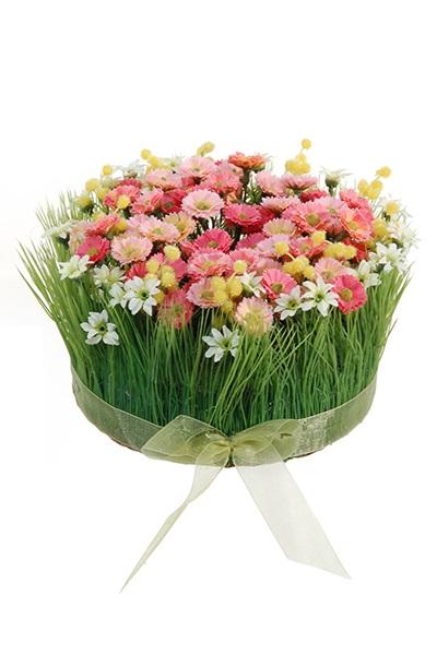 Umělé květinové aranžmá sedmikrásky, tráva HAULANI, růžovo-bílá, 12cm, Ø20cm
