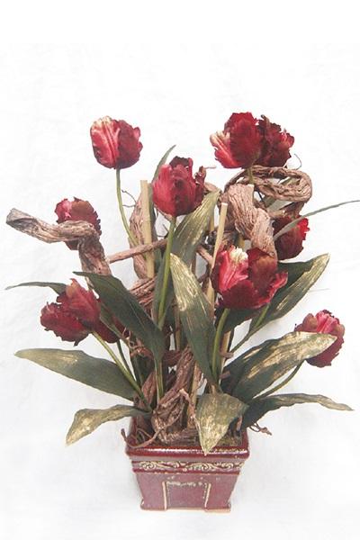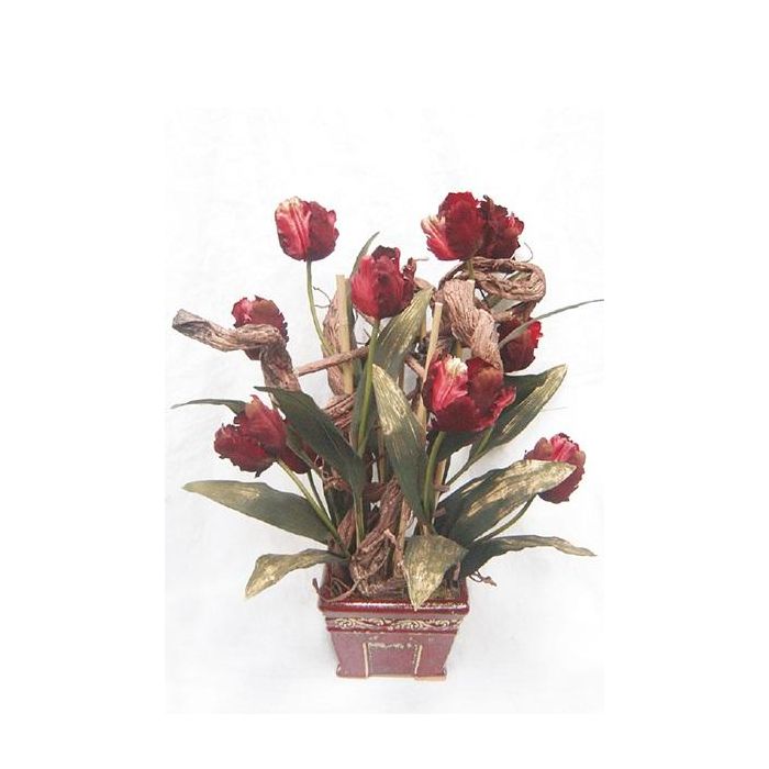 Umělé květinové aranžmá tulipány, vývrtka vrby THARO, dekorativní květináč, červenozlatá barva, 70cm, Ø40cm