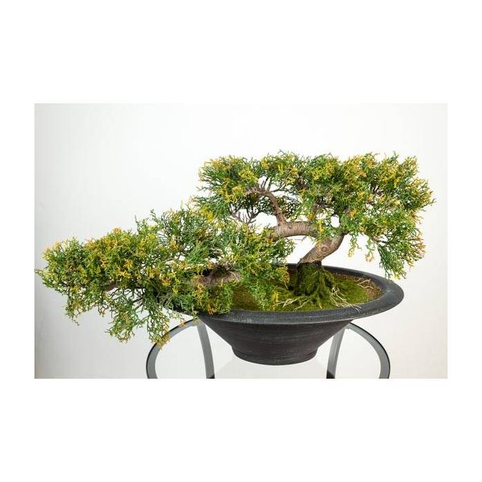 Umělý strom bonsai cedr GABRIA, s kořeny, v dekorační míse, zeleno-oranžová, 40cm