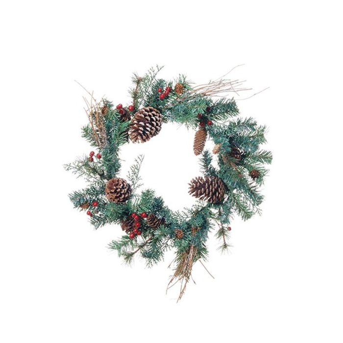 Umělý věnec borový, cedrový MIRANDA, bobule, šišky, zasněžený, zeleno-červený, Ø45cm
