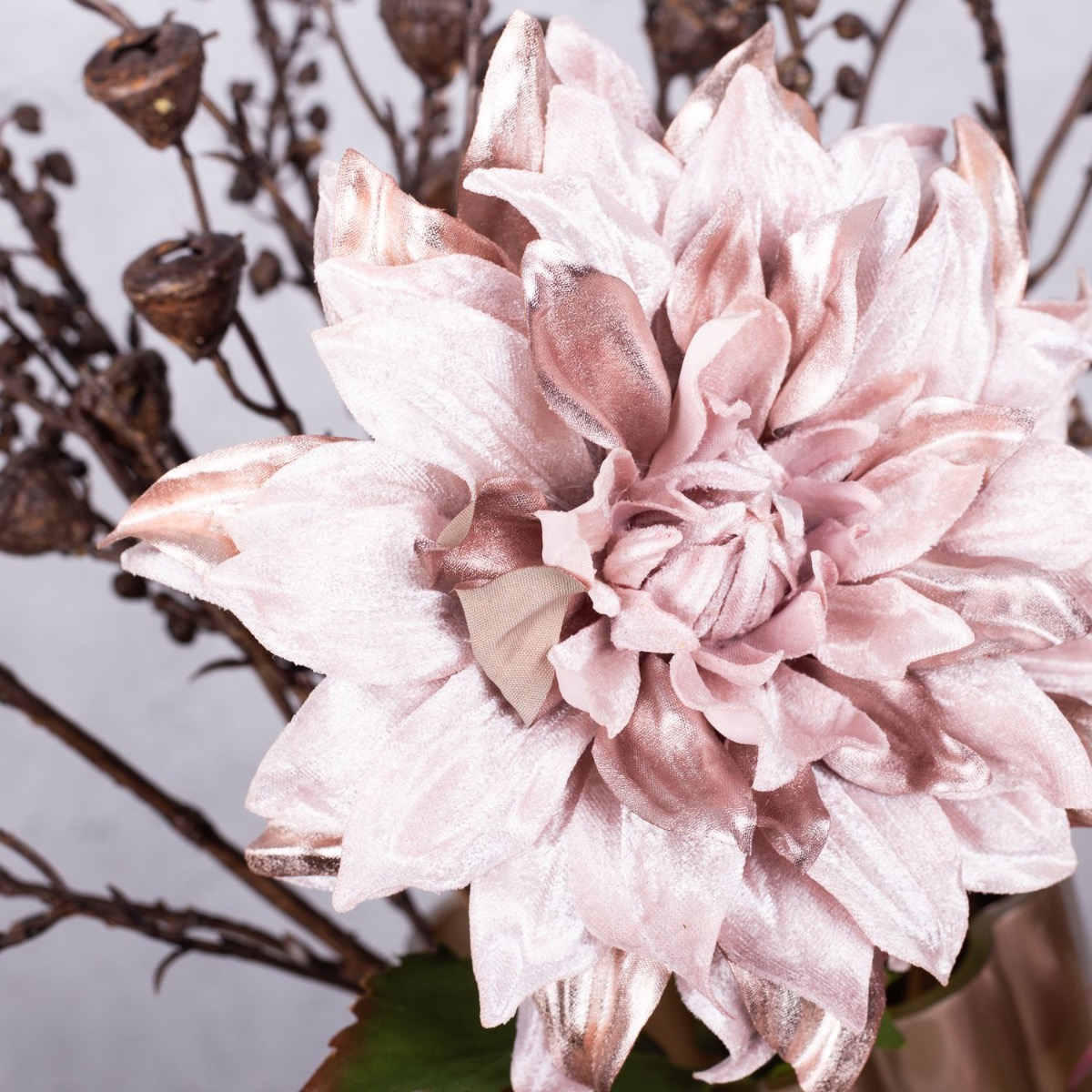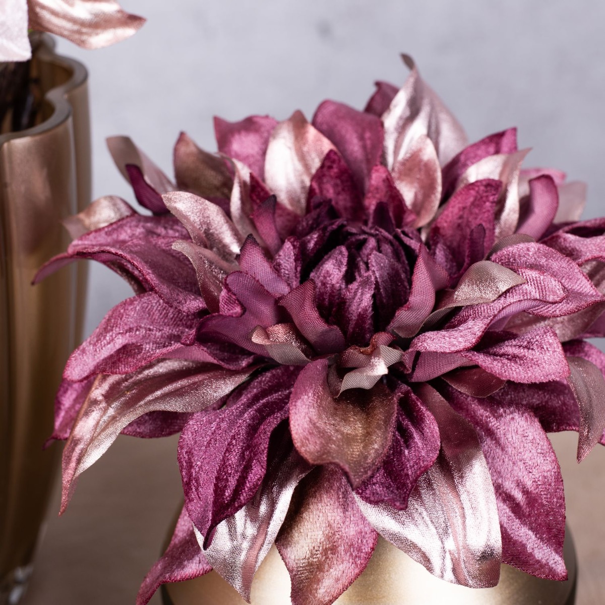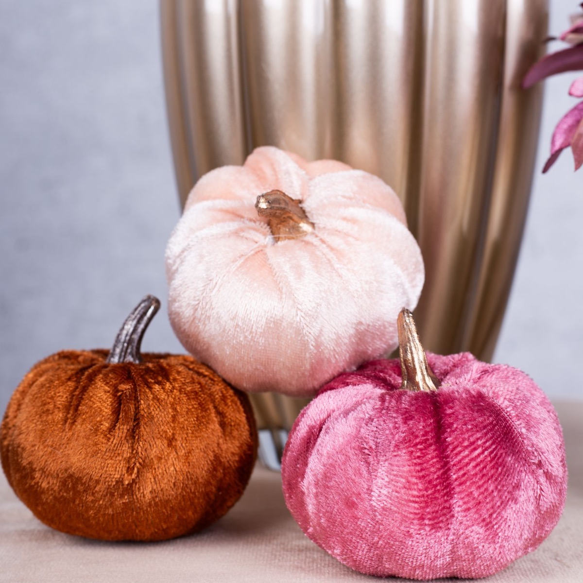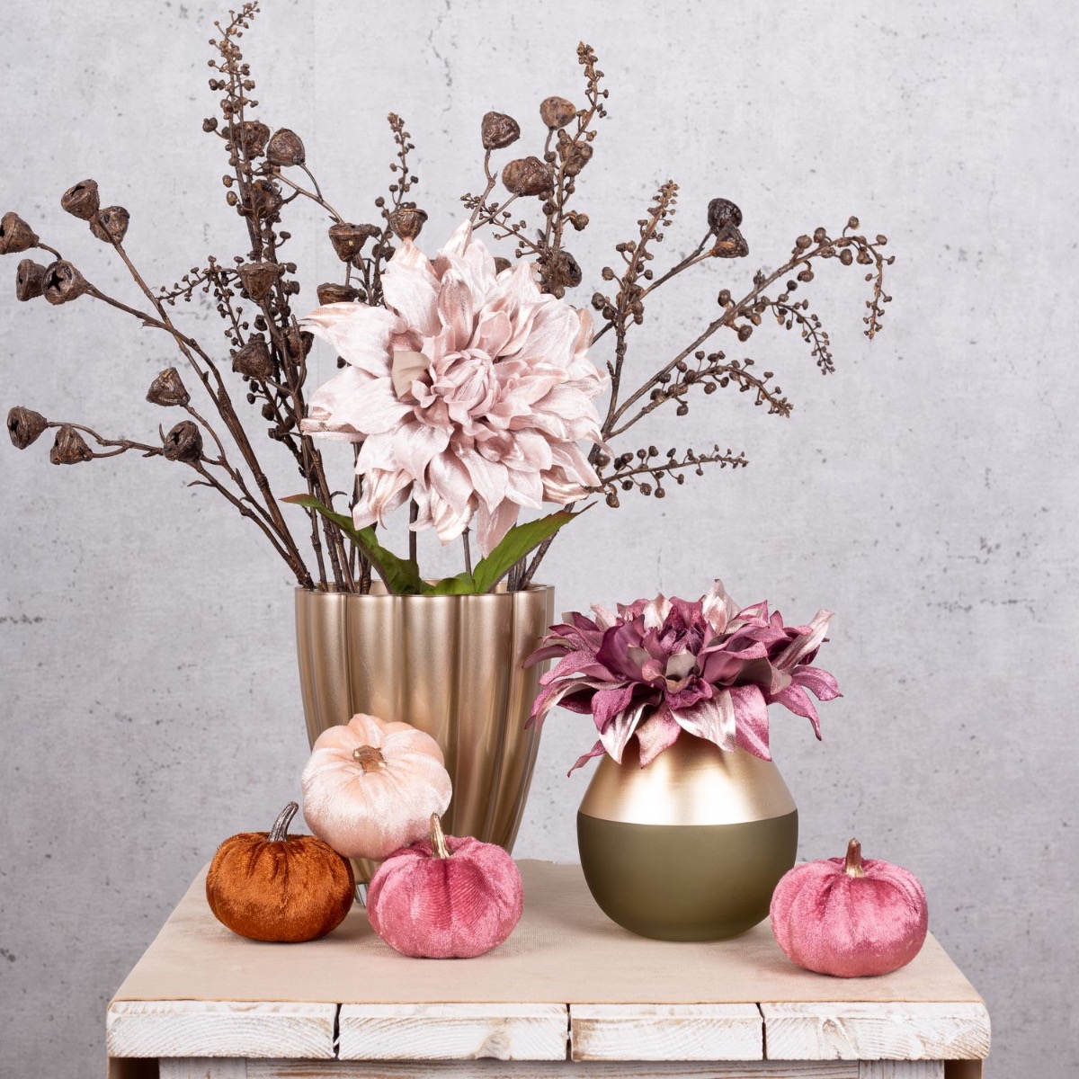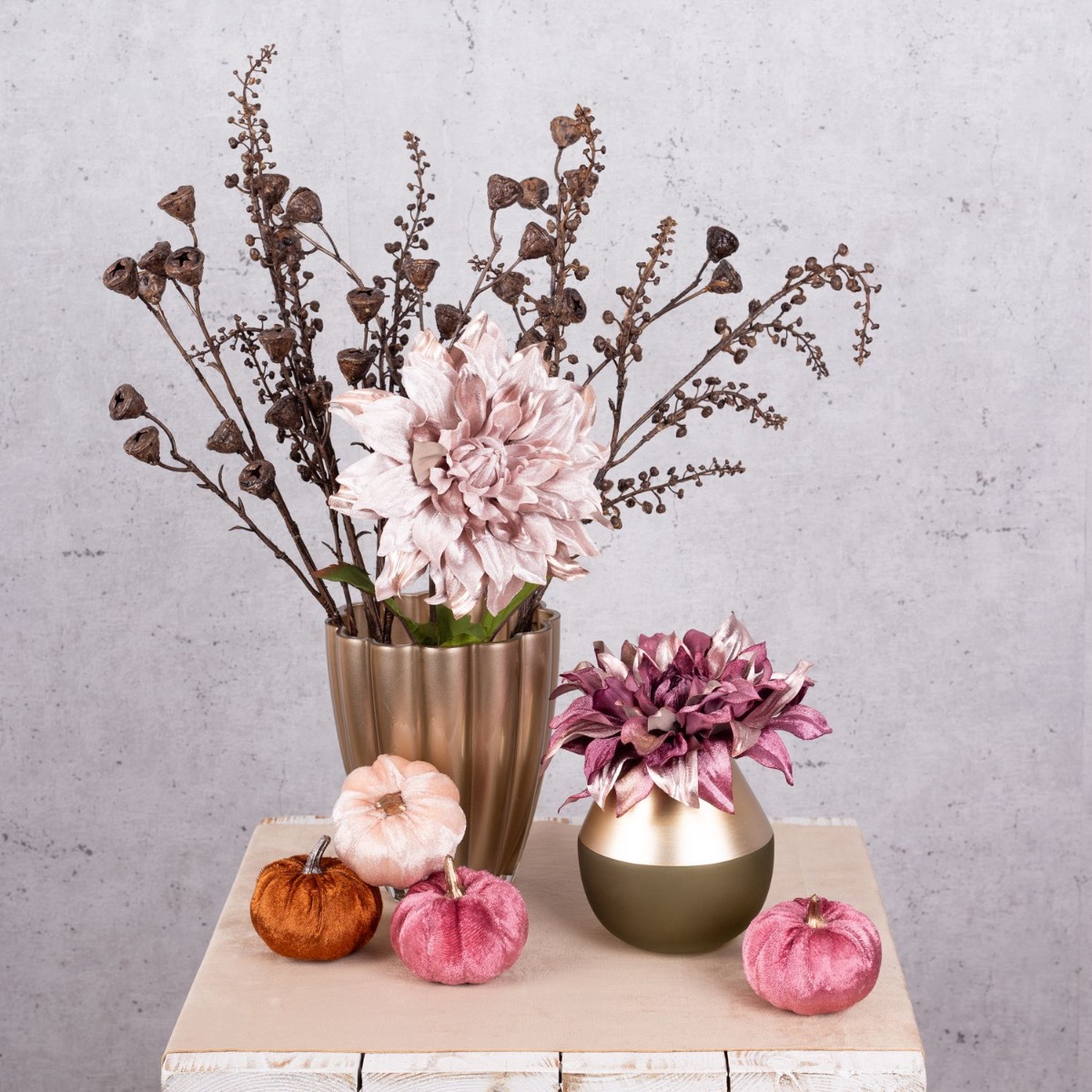 Zlato září sametem! Naše sametové výrobky jsou obzvlášť trendy a jsou tak měkké a nadýchané, že se do nich budete chtít opravdu zachumlat. Jemné odstíny růžové v kombinaci se zlatou a dalšími podzimními barvami dělají tento vzhled tak výjimečným. Velká jiřina osvěžuje hnědé mochyně a eukalyptové větvičky s plody, které stojí v matné zlaté váze a dokonale ladí s útulnými dýněmi. Tento vzhled je ideální pro podzim a vyznačuje se moderní barevností bez klasické oranžové barvy podzimních dýní. Zkrášlete svůj domov našimi nápady. Nakupujte tento vzhled!
