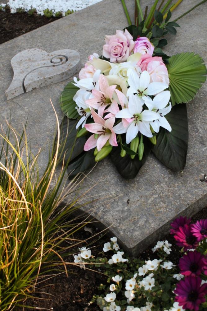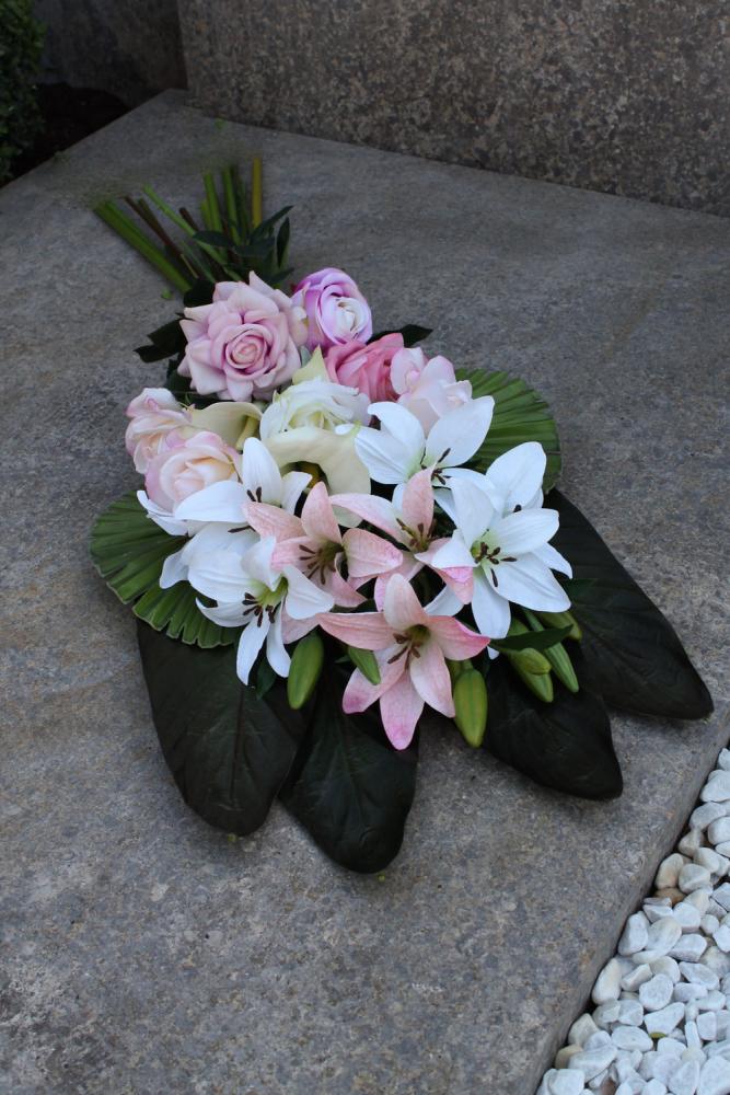 Květiny na počest mrtvých! Tento vzhled hrobu je trochu složitější, ale o to působivější. Bílé lilie symbolizují čistotu a jsou spojovány s novým životem a znovuzrozením. Jsou proto oblíbeným dekoračním prvkem při smutečních obřadech, ale často také darem na svatbách. Květinovou výzdobu v tomto aranžmá doplňují růže v různých růžových, bílých a růžových pastelových odstínech a bílé kaly. Samozřejmě by neměla chybět nějaká zeleň. Byly vybrány dva druhy ozdobných listů, které tvoří základ pro květinovou výzdobu na vrcholu. Nakupte si tento vzhled!