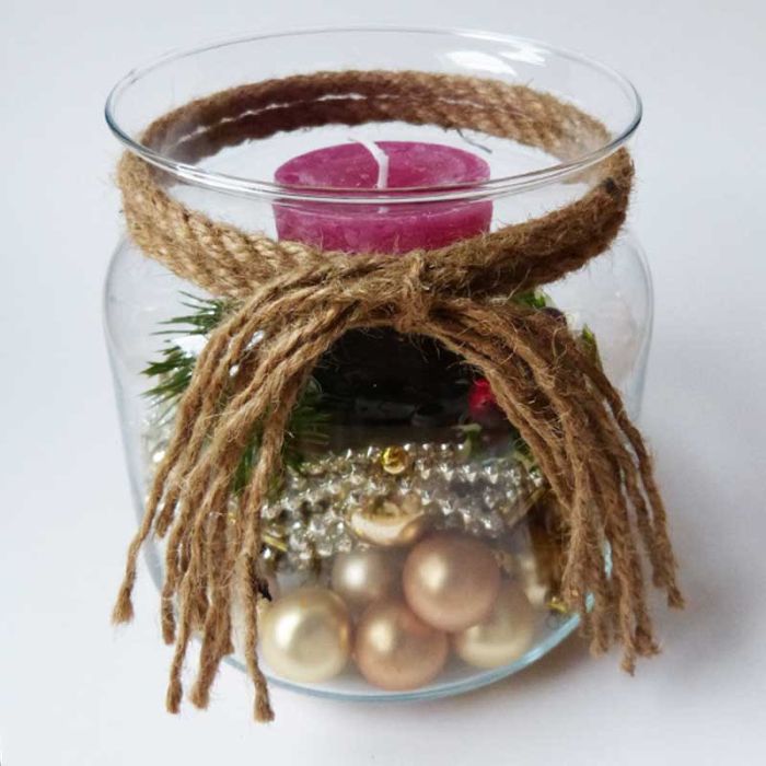 Designový tip: Nejprve umístěte ozdoby do sklenice, poté na ně umístěte svícen a svíčku. V případě potřeby jedlovou větvičku mírně zkraťte nebo ji rozřežte na jednotlivé větvičky.