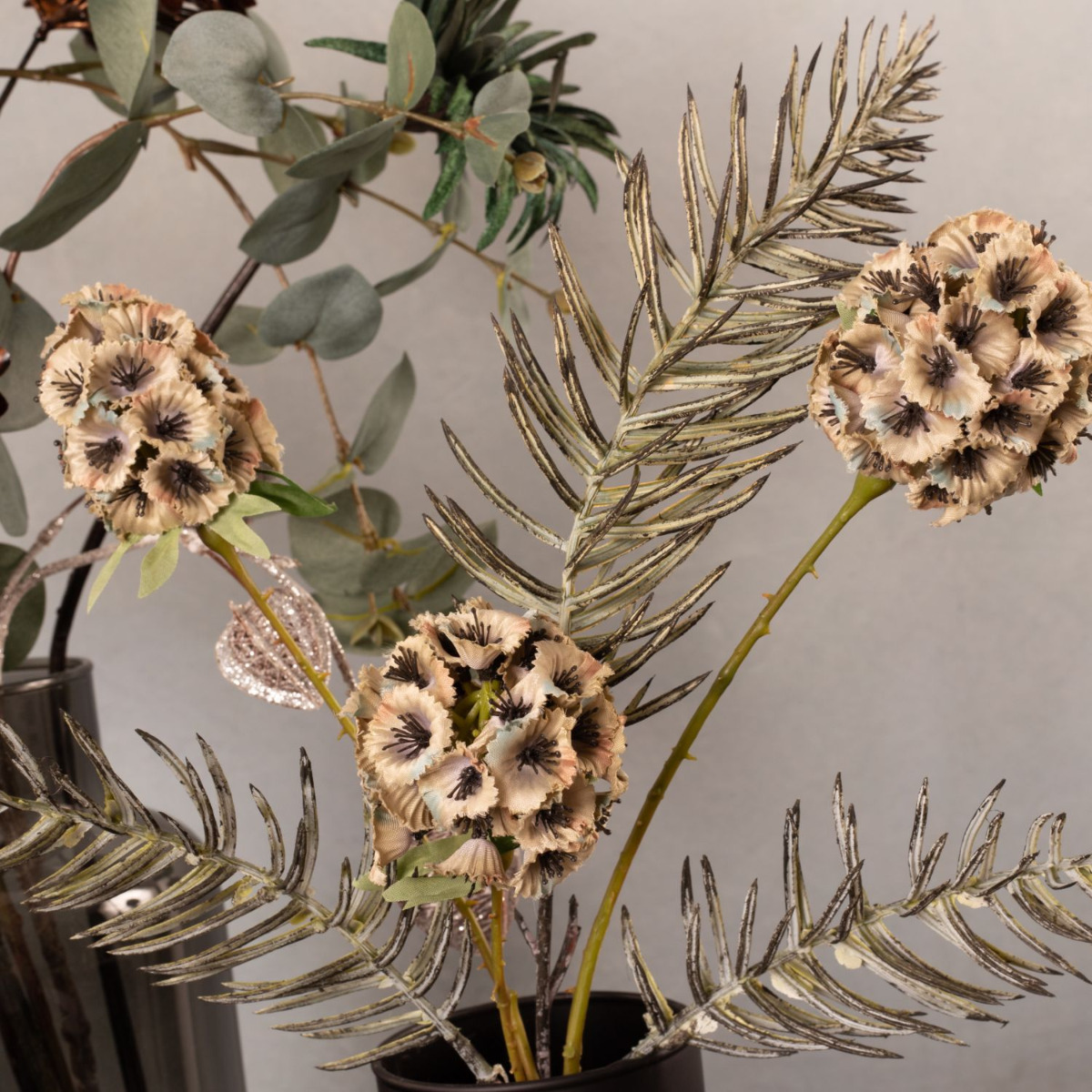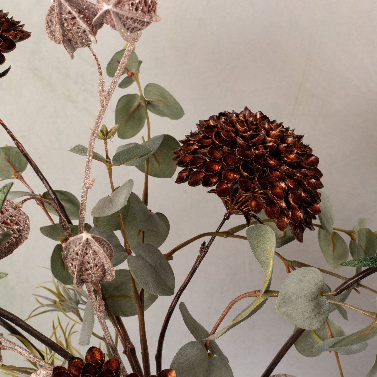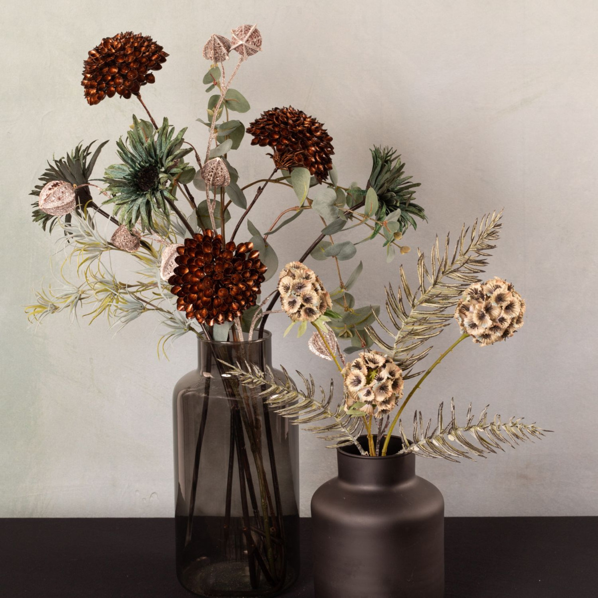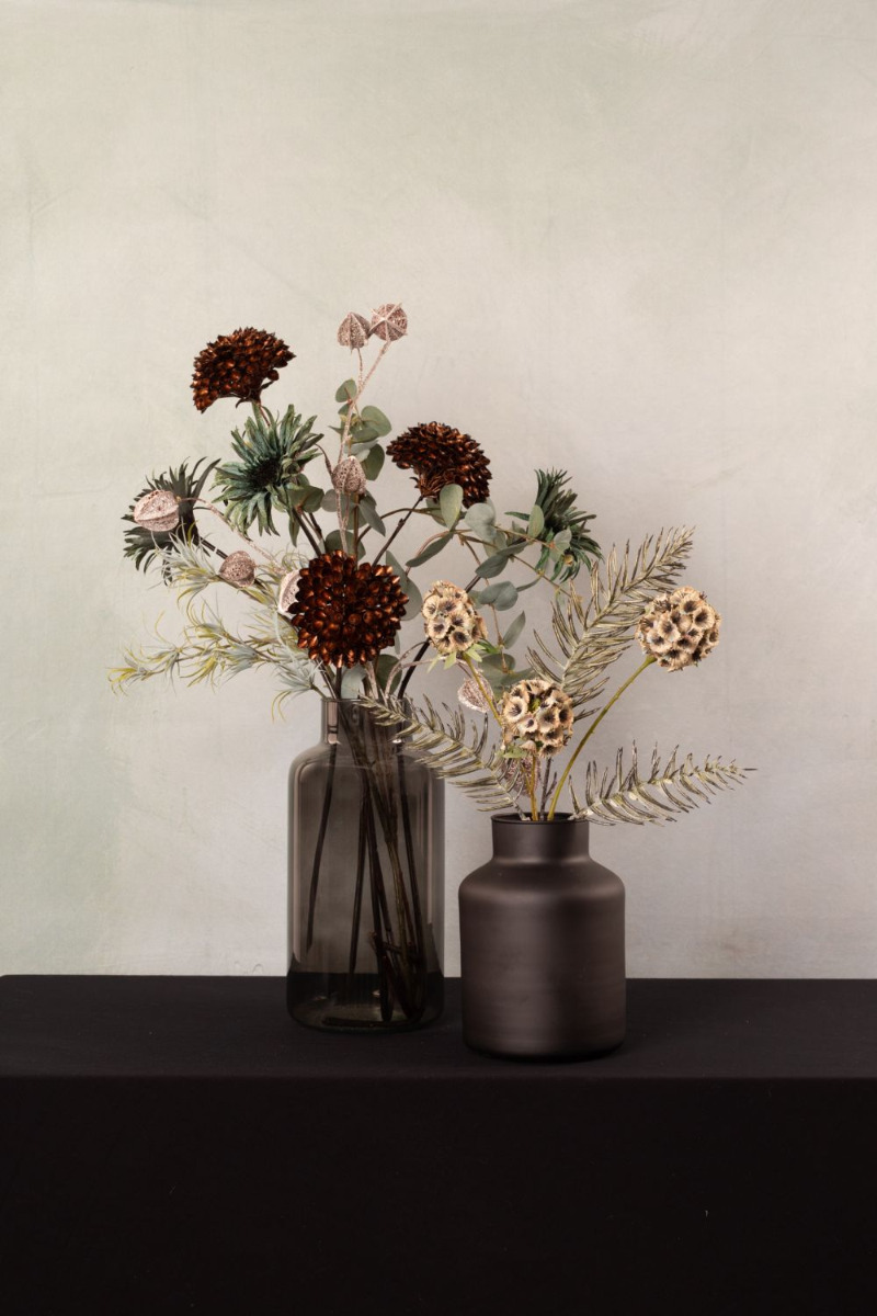 Vánoční elegance! V kombinaci s naším vzhledem "Elegance ala Arte Nuveau" vytváří tato kompozice vánoční náladu. Fialka v hnědé barvě se stříbrnými třpytkami v kombinaci s jemnými a výraznými petrolejovými tóny dodává vzhledu zcela nový podzimní nádech. Sametový povrch gerbery vybízí k přitulení. Kulovité květy kabiózy hvězdicovité a ostnitá tillandsie připomínají sněženky a první mráz, který brzy přijde. Obzvlášť zimní vzhled však dodává jehličí cypřiše, které samozřejmě nesmí chybět. Člověk si tak opravdu připadá jako o Vánocích. Nakupte si vzhled!
