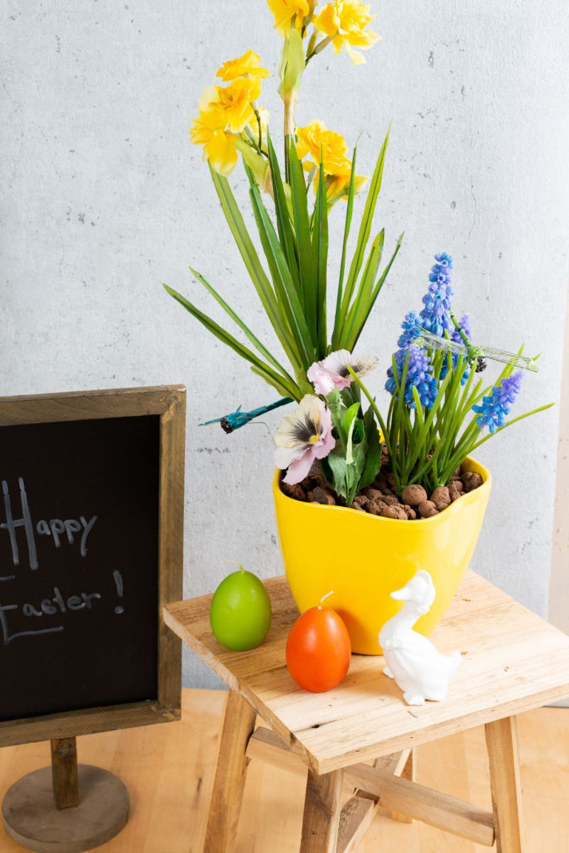 Probouzení jara! Typickými jarními květinami jsou narcisy a hroznovité hyacinty. Naaranžované v květináči v odpovídající barvě roznesou velikonoční náladu ve vašem domově. Svíčky ve tvaru vajíček celou sestavu dokonale doplňují. Nakupte si tento vzhled!