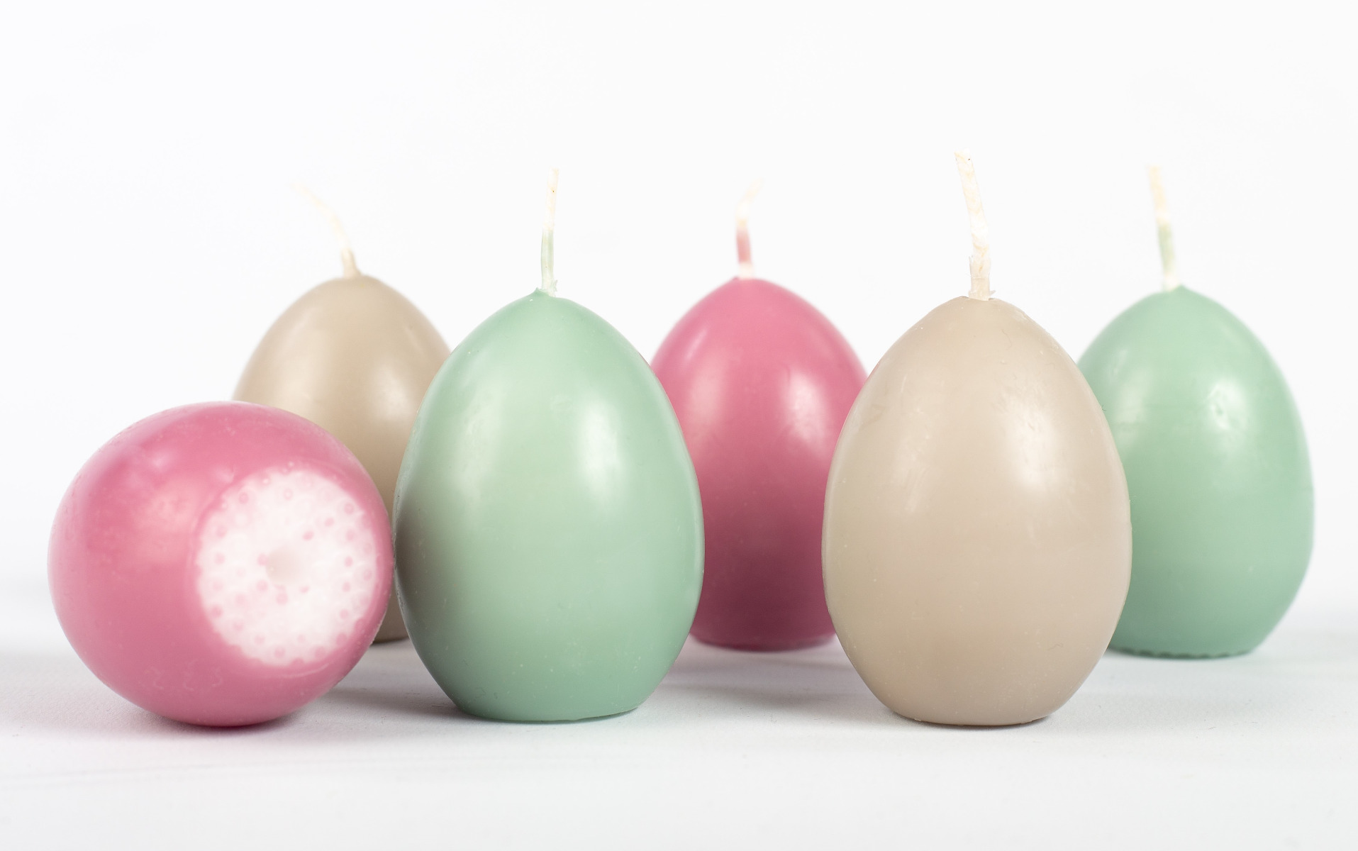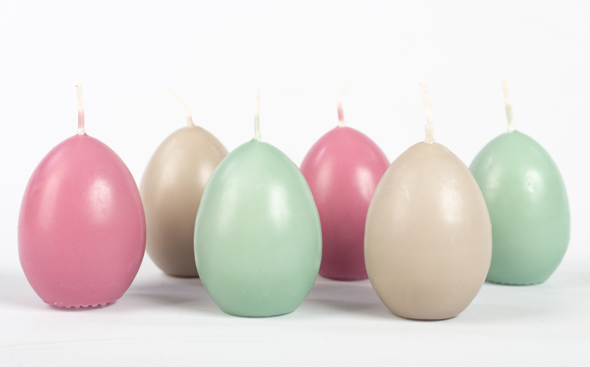 Velikonoční svíčky na vajíčka LEONITA, 6 kusů, tmavě růžovo-šedo-mentolová, 6cm, 4,5cm, 7h - Vyrobeno v Německu