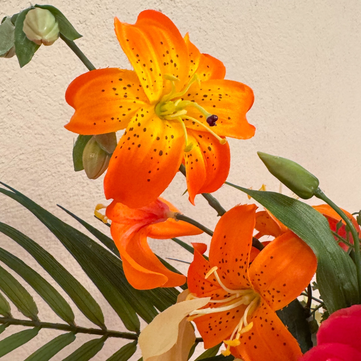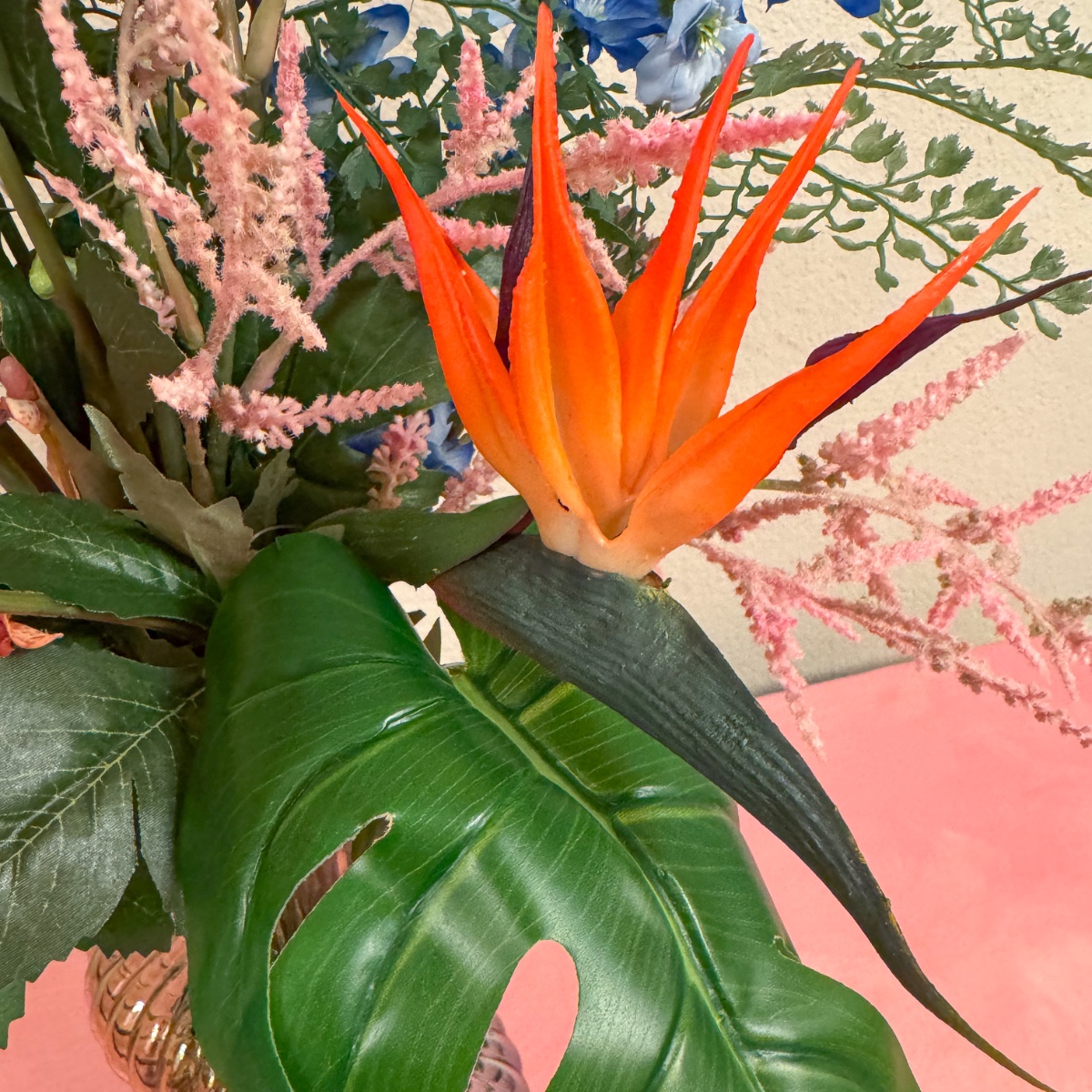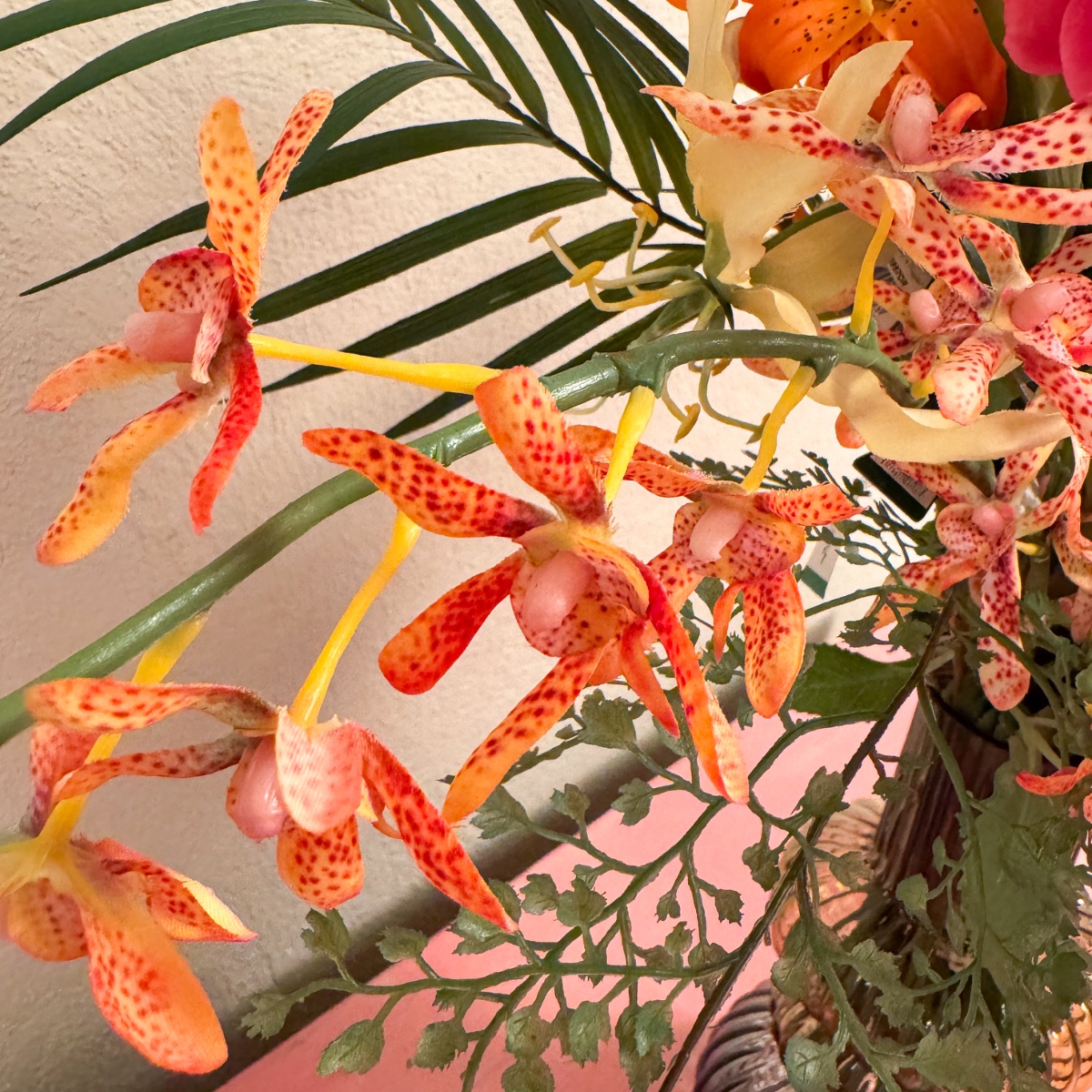 Exotická krása! Pro stylově zařízenou jídelnu vyzdobenou rajskými obrazy je třeba vytvořit kytici květin, která harmonicky zapadne do celkového obrazu. Barevně sladěná a jemně naaranžovaná nenápadně vyjadřuje vzpomínku na nezapomenutelnou dovolenou - aranžmá, které vytváří atmosféru a naplňuje místnost tichou elegancí. Nakupte si tento vzhled!