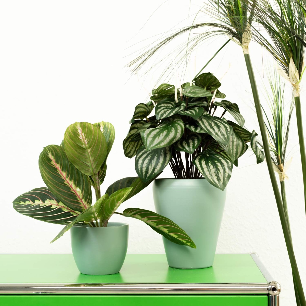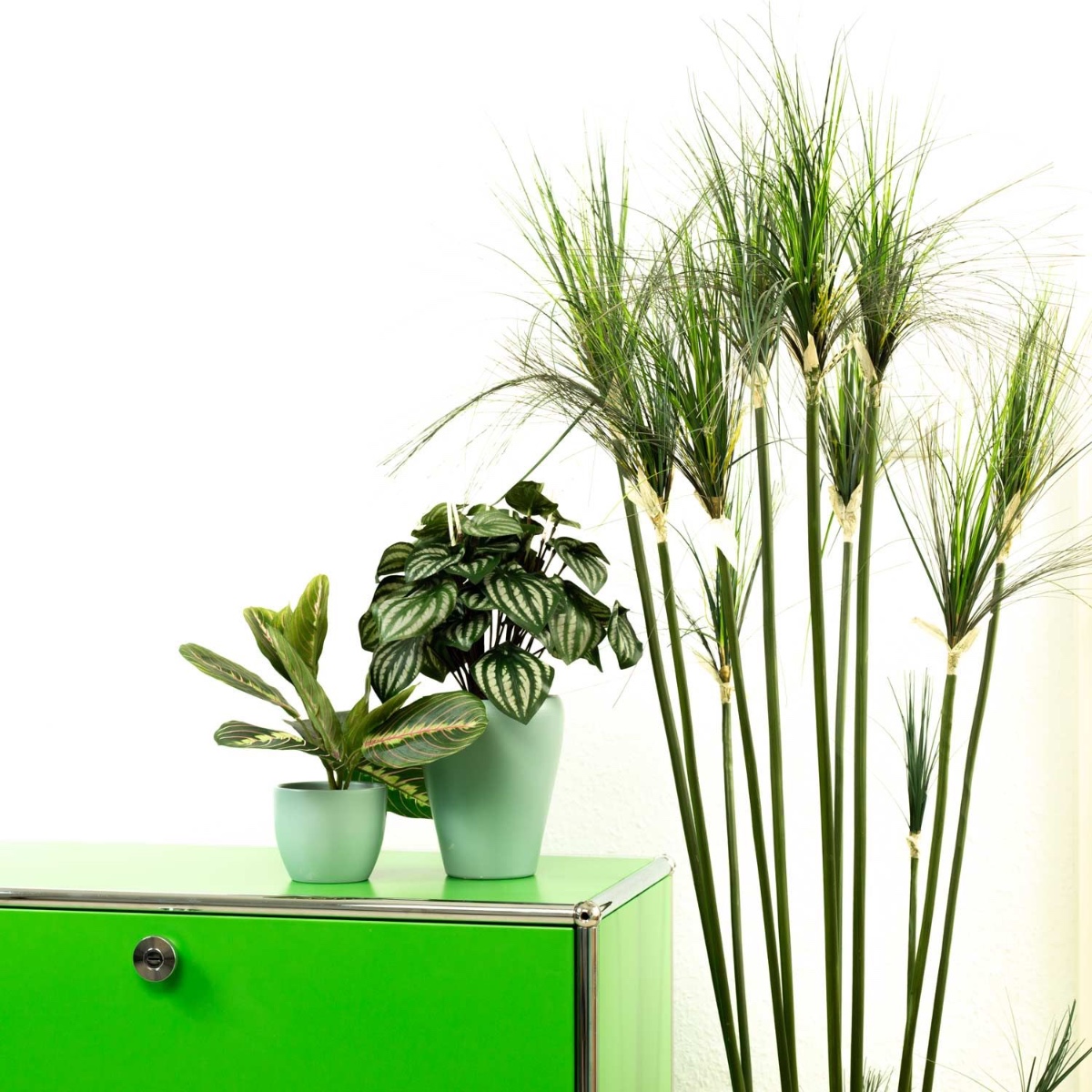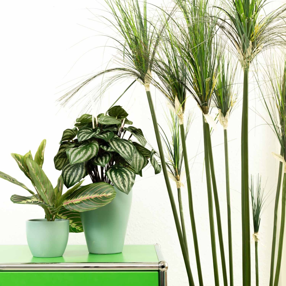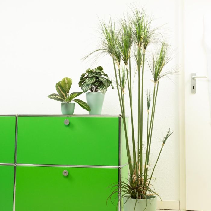 Zelená a mátová! Zelené rostliny jsou obzvláště vhodné jako dekorace pro každodenní kancelářský život, protože působí relaxačně na oči i mysl. Jak praktické, že je nemusíte zalévat ani tehdy, když jste pohlceni prací, protože umělé rostliny zůstávají vždy zelené a nepotřebují téměř žádnou péči. Zakrslý pepř a maranta s tímto vzhledem dokonale ladí a skvěle se hodí ke květináčům v mátové barvě. Práce může vypadat takhle krásně! Nakupte si tento vzhled!