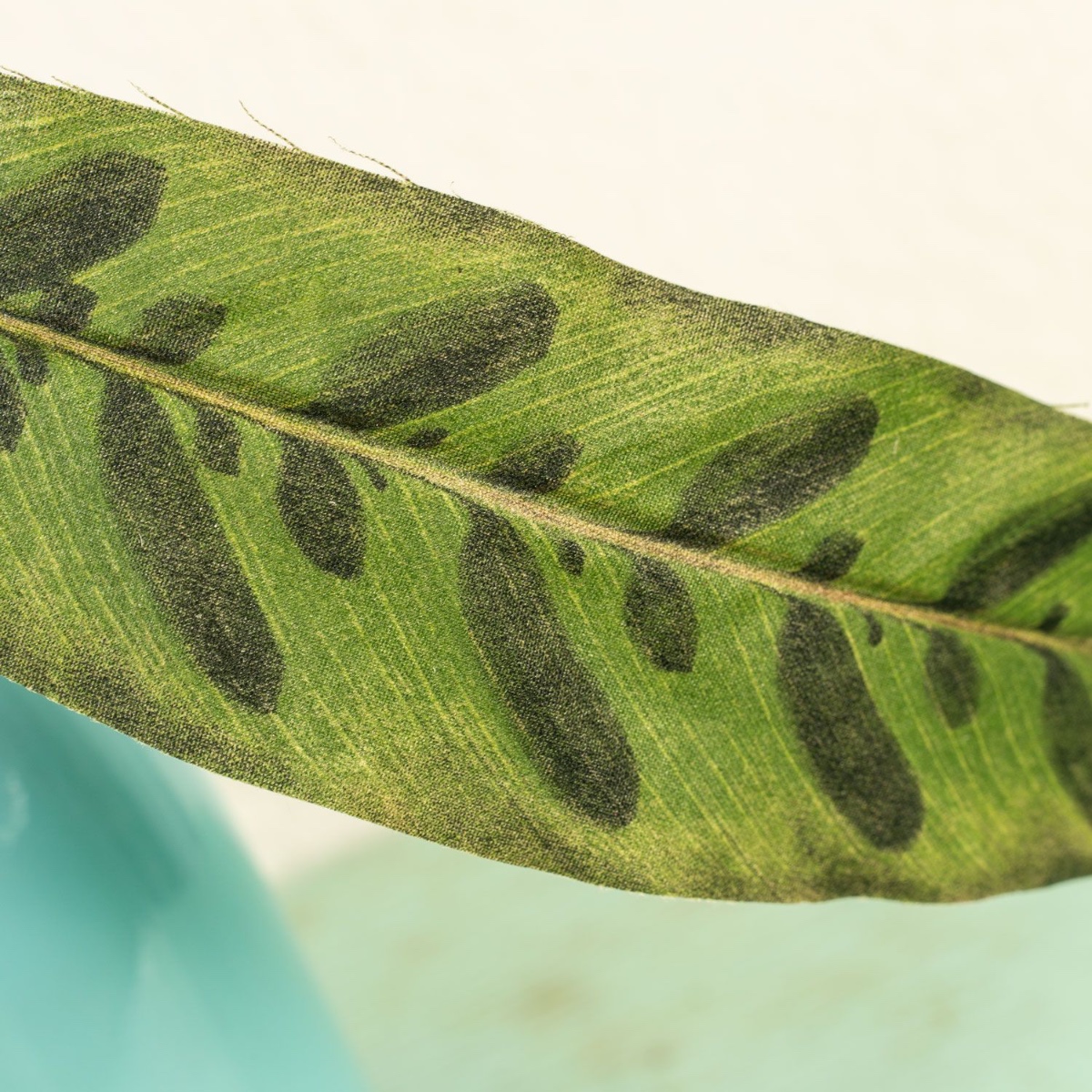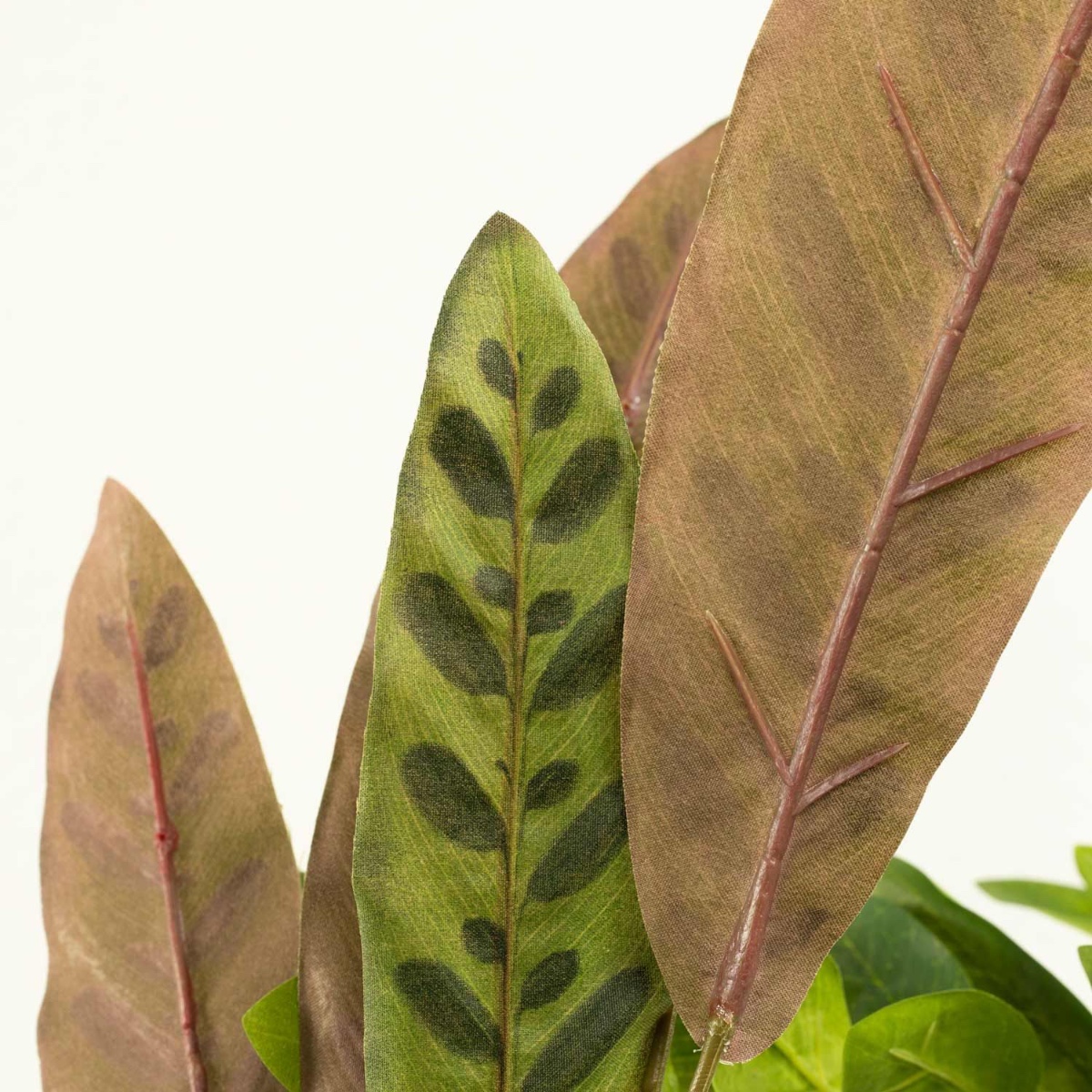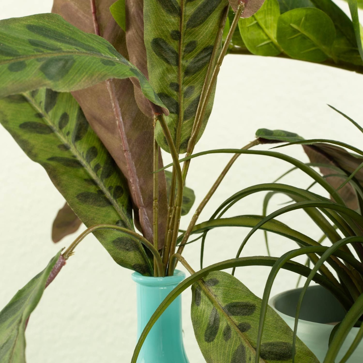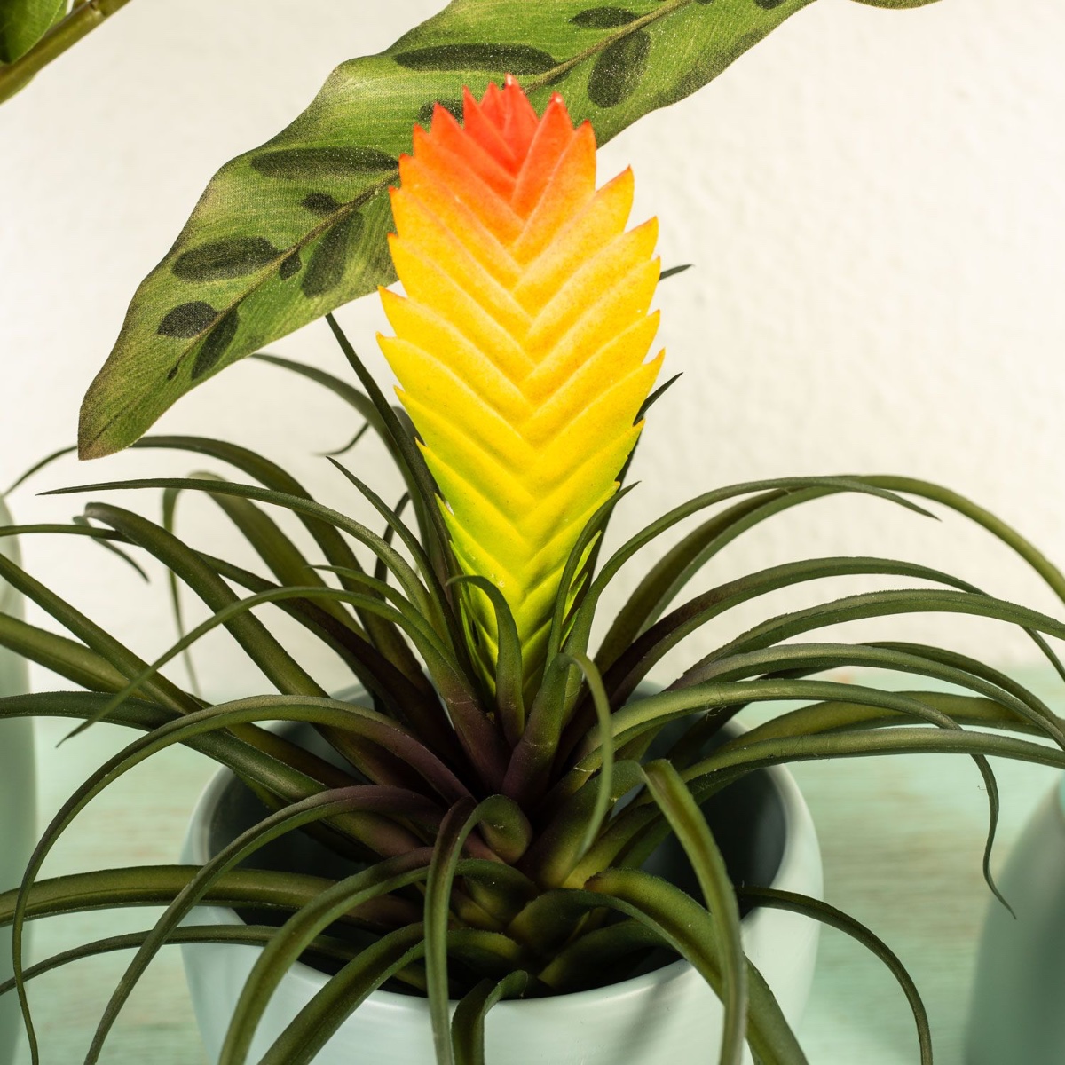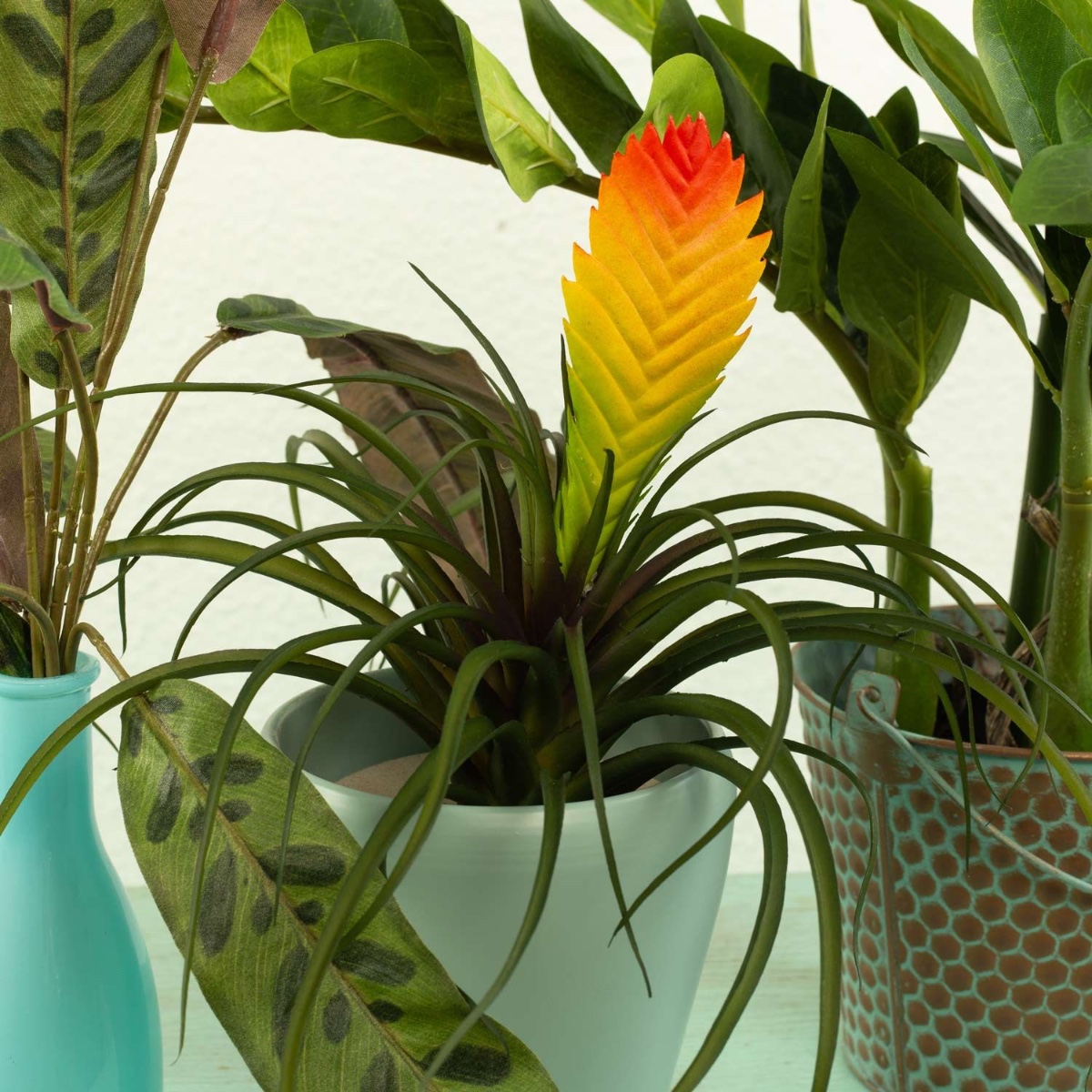 Designový tip: Pírko pro štěstí jednoduše umístěte do květináče. Stonek Calathey jednoduše vložte do láhve a stonek Vriesea umístěte do vysokého květináče s orchidejemi a naplňte korkovými granulemi. Všechny rostliny ohněte do tvaru.