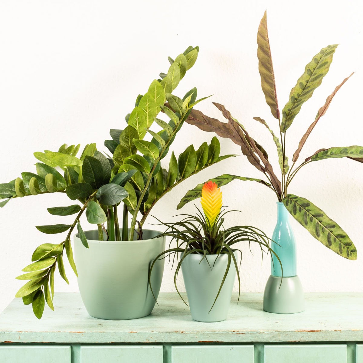 Modrá a zelená! Zelené rostliny jednoduše udělají z každého domova krásnější místo. Působí uklidňujícím dojmem a dodávají místnosti pocit útulnosti a domova. Sbírka různých květináčů působí vesele a hravě a s různými zelenými rostlinami se stává aranžmá, které se hodí do každého interiéru. Nakupte si tento vzhled!