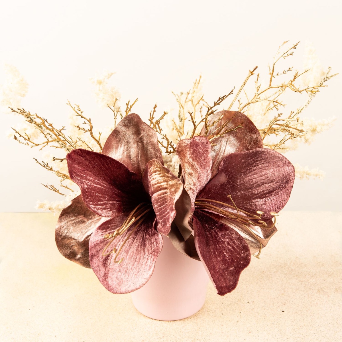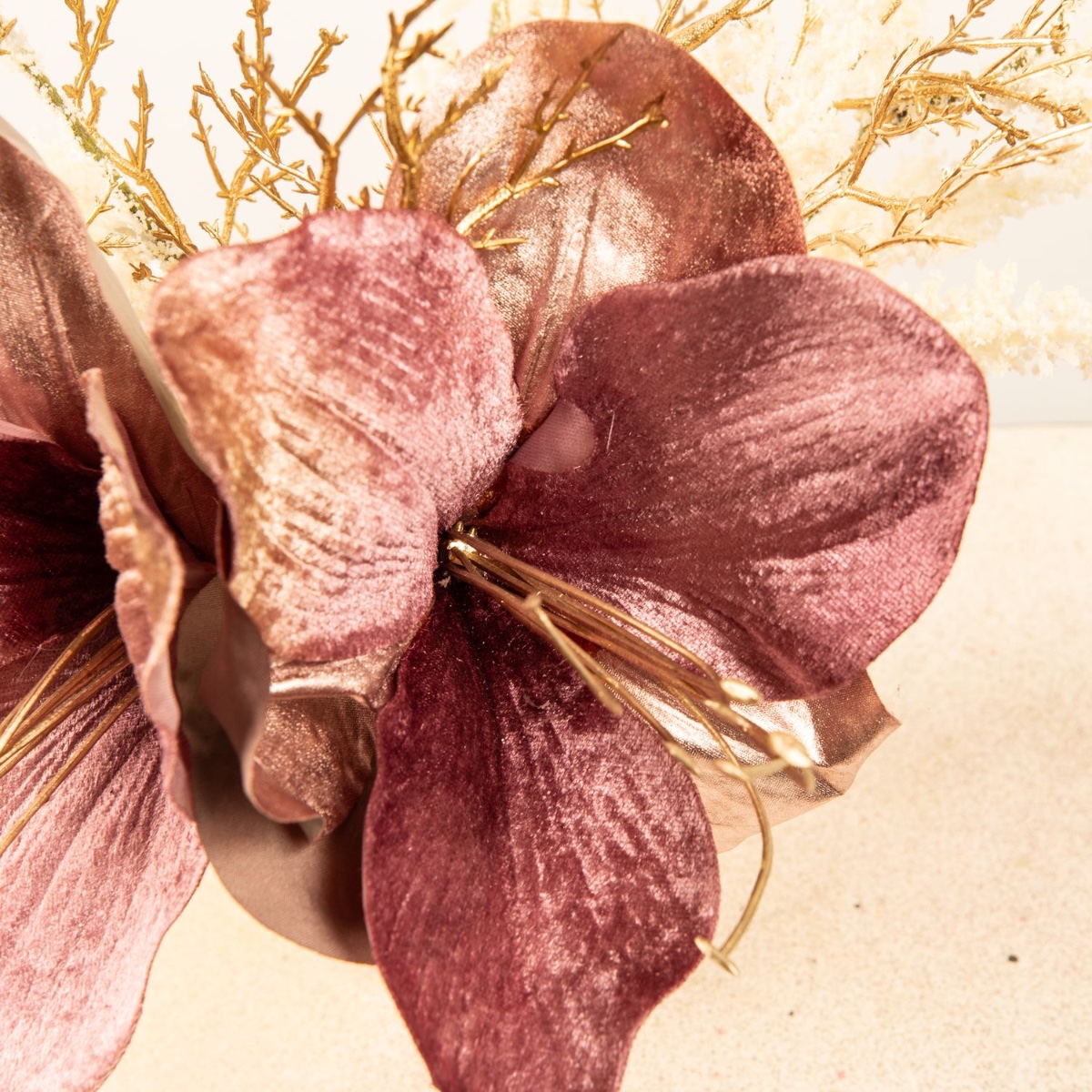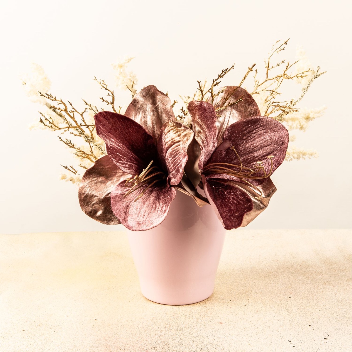 Růžová a zlatá! Okouzlující kombinace, která se obzvlášť hodí ke svátečnímu období. Růžový květináč s orchidejemi dokonale barevně ladí se sametovou Amarillys, která znamená náklonnost a přátelství. Zlaté a bílé zasněžené větvičky dodávají tomuto vzhledu ještě větší šmrnc a skutečně ukazují květinu v její nejlepší světle. Nakupte si tento vzhled!