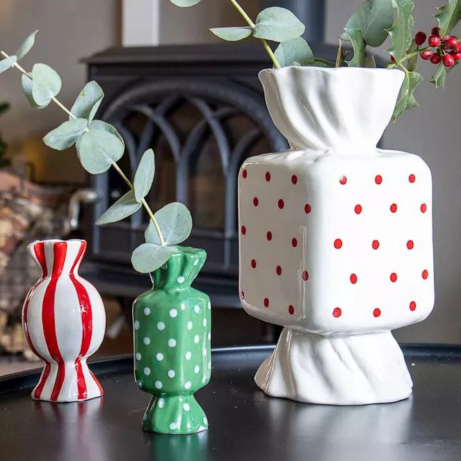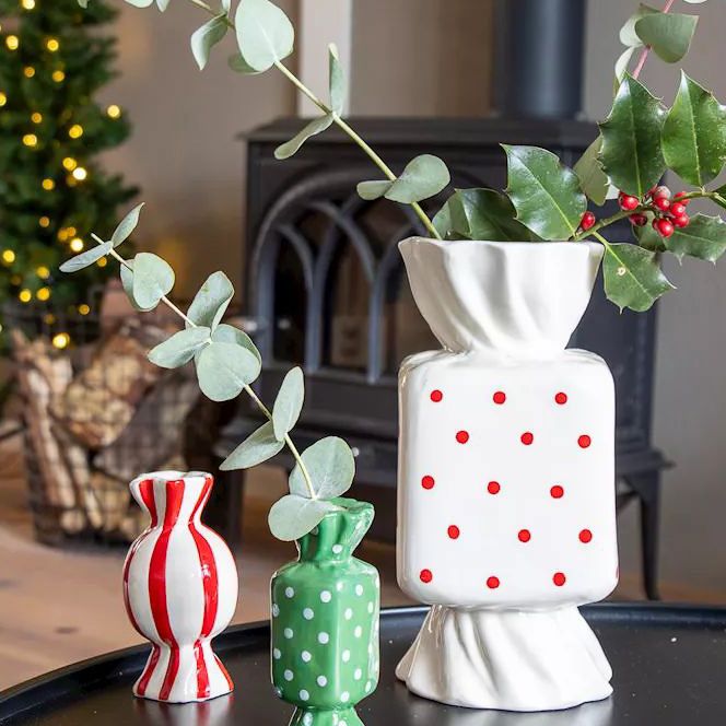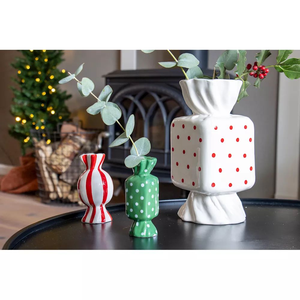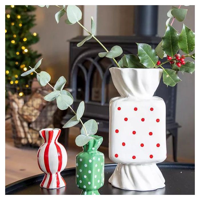 Barevné akcenty pro slavnostní okamžiky! Malé, hravé keramické vázy ve tvaru bonbónů dodávají barevné akcenty a vyzařují lehkost. Minimalisticky zdobené větvičkami cesmíny a eukalyptu vytvářejí okouzlující zimní aranžmá, která rozšiřují radost. V pozadí se třpytí vánoční stromeček s řetězem světýlek a ponoří scénu do teplého, magického světla. Atmosférická souhra barev, přírody a vánočního kouzla – perfektní pro stylové vychutnání zimních okamžiků. Kupte si tento look!