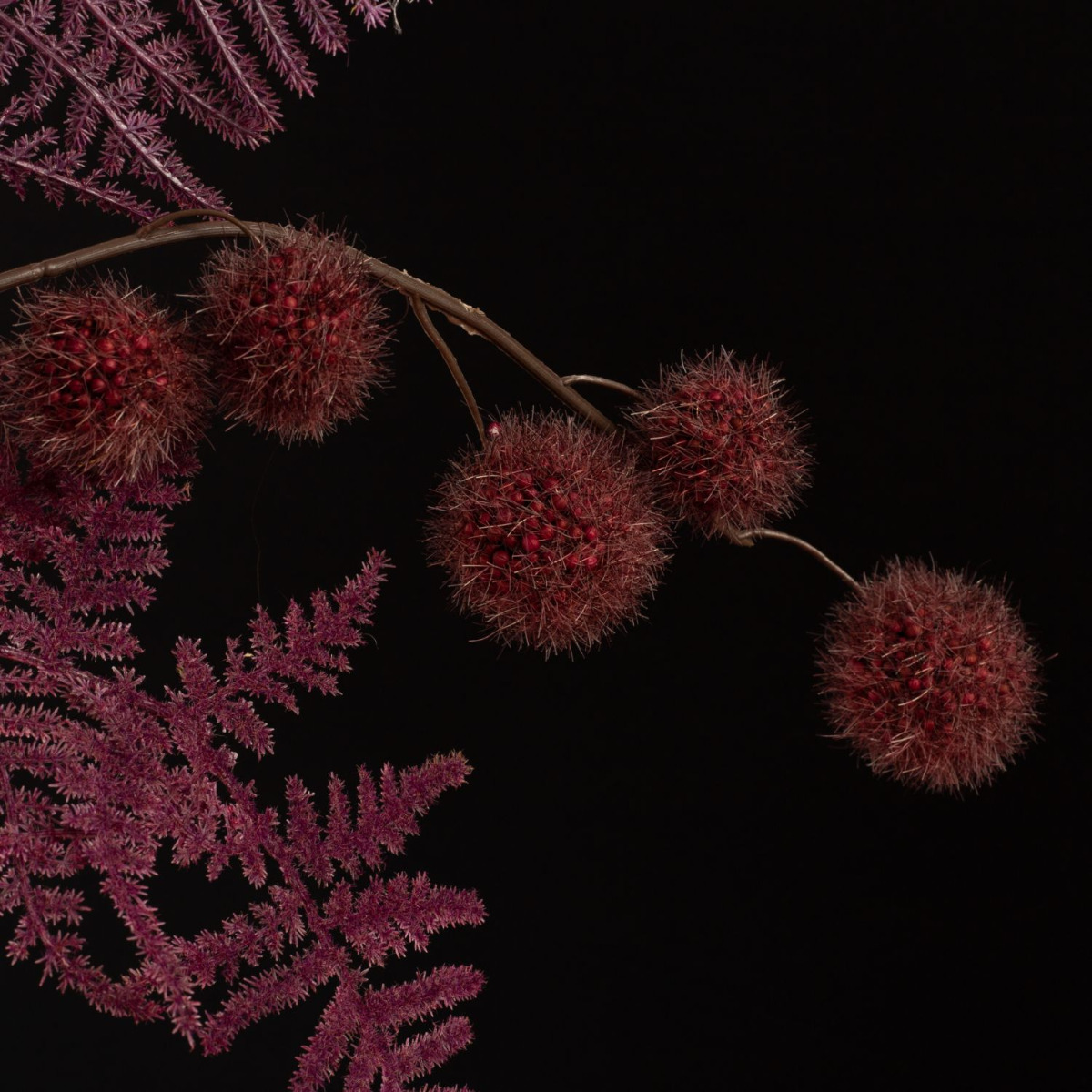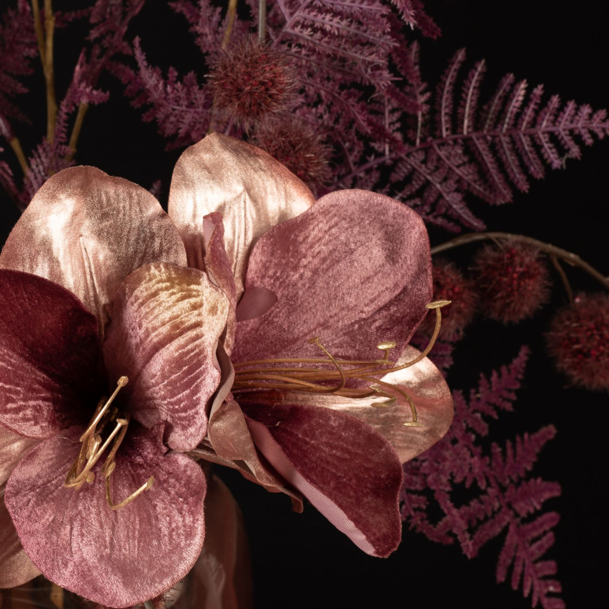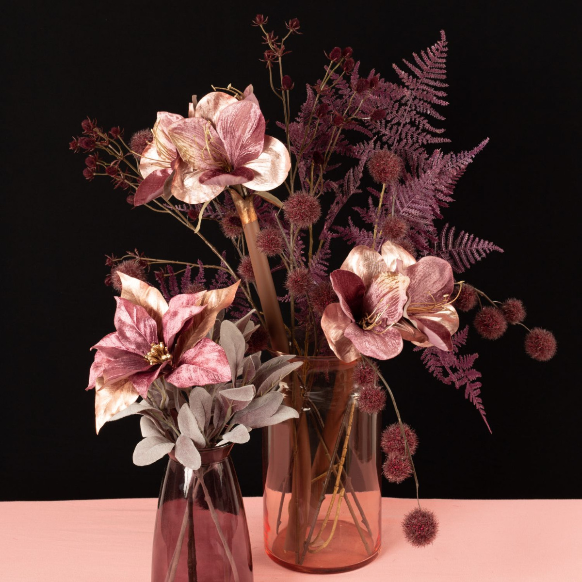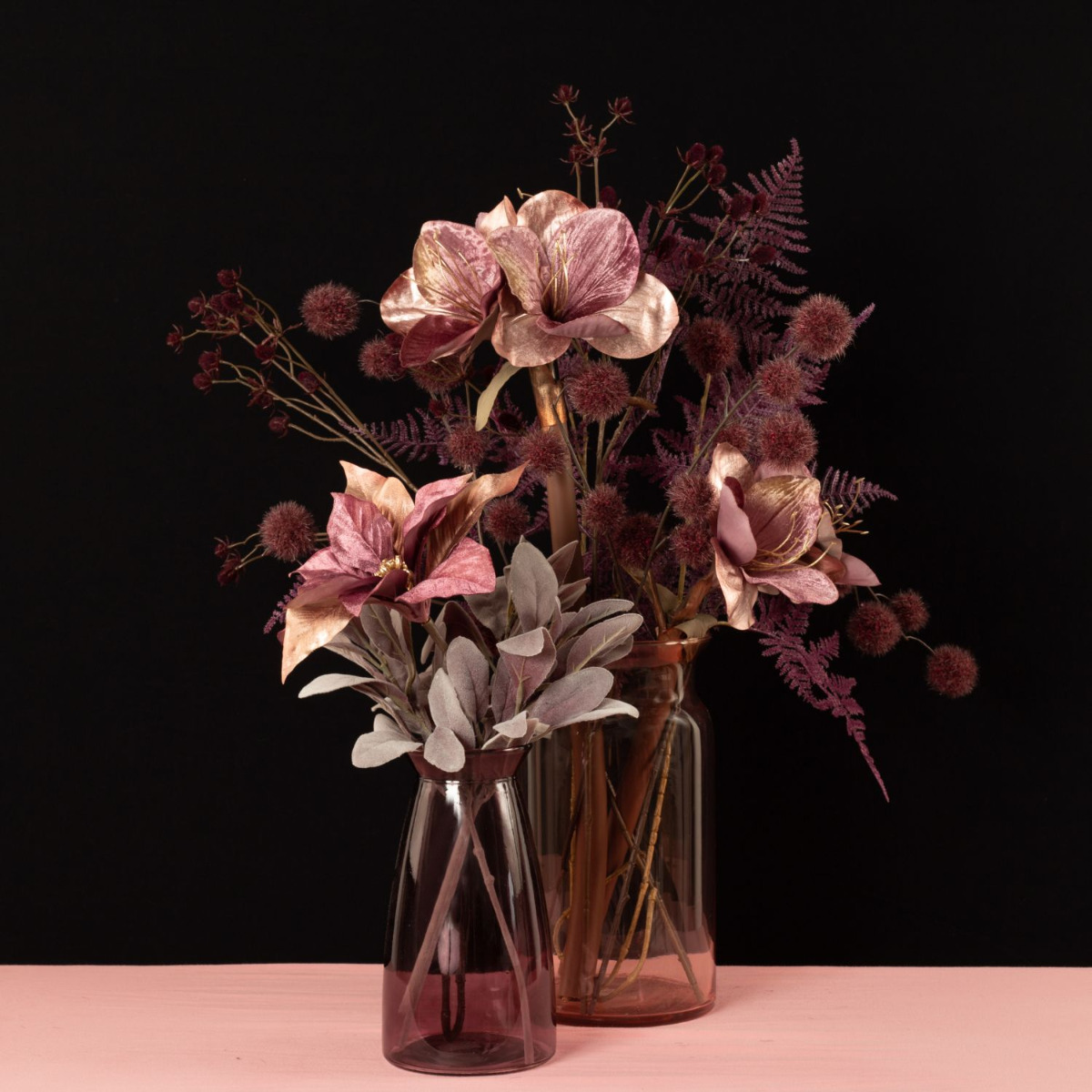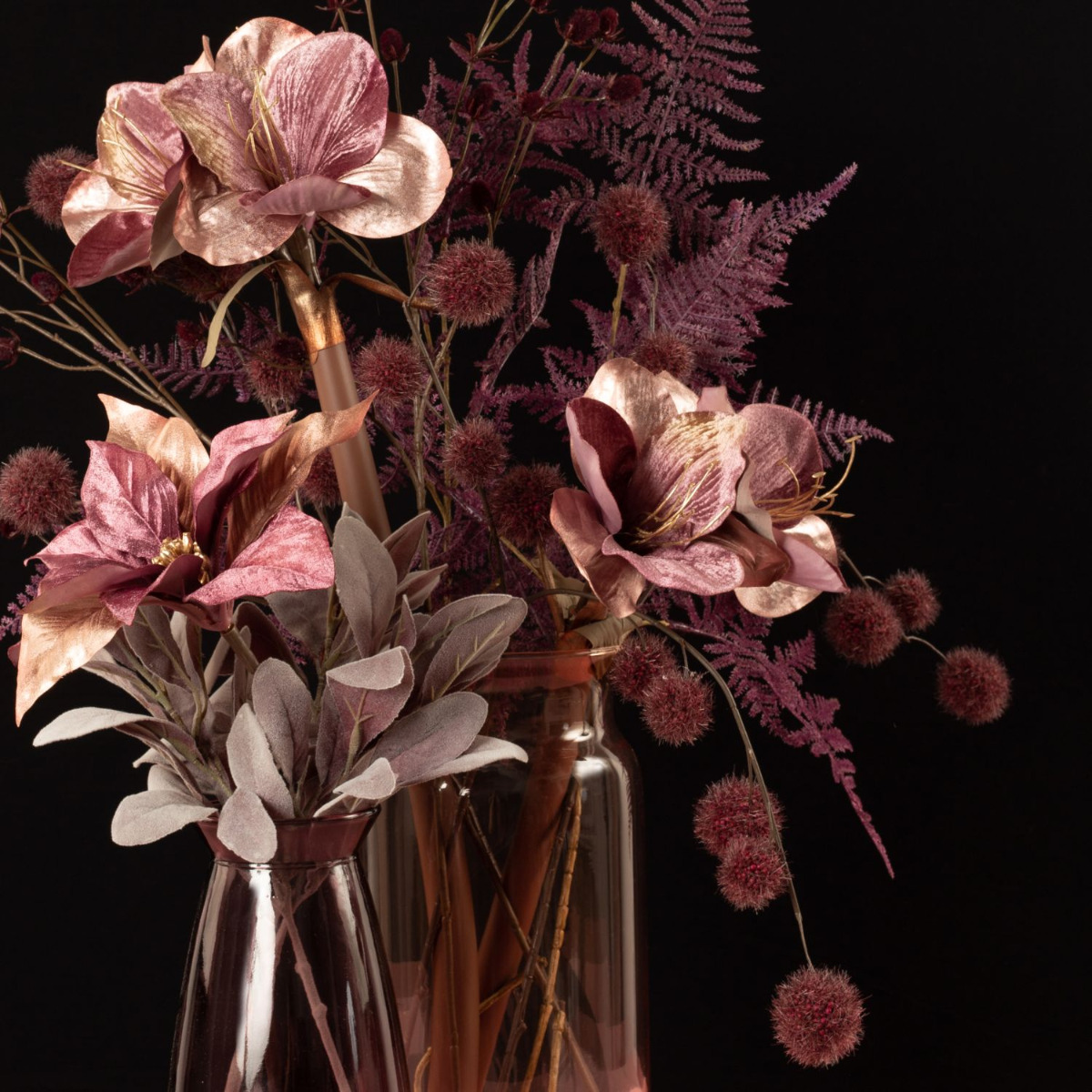 Rosé a vínová! To jsou nejen dobrá vína, která se hodí k zimě, ale tyto barvy také vykouzlí teplo ve vašem domově. Zde použité sametové zimní květiny jsou moderní interpretací Vánoc v tomto neobvyklém barevném provedení. Větvička vínově červených kuliček Gomphorcarpus připomíná malé vánoční koule, které obklopují velké květy. Pro všechny, kteří už mají o Vánocích dost červené a zelené barvy. Nakupte si vzhled!