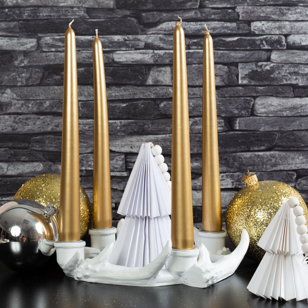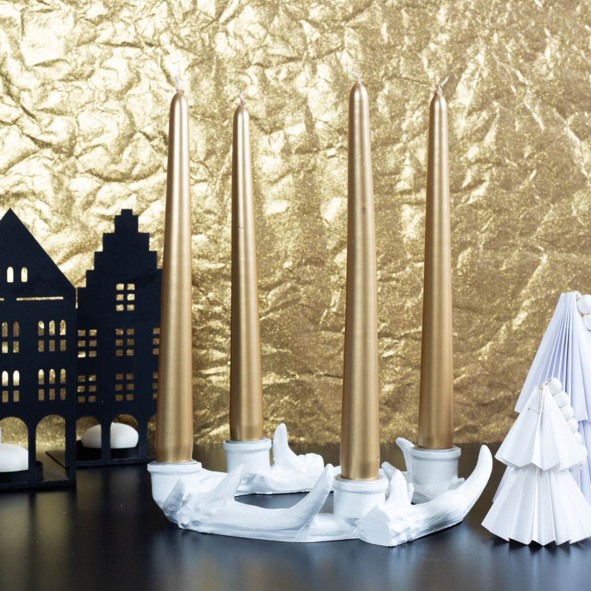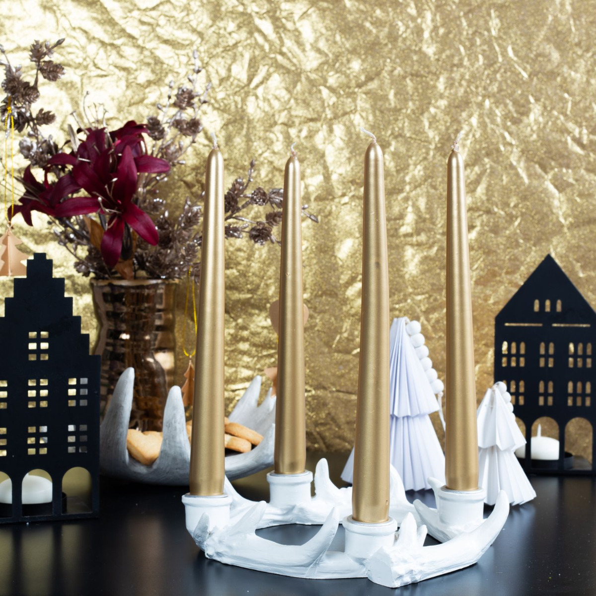 Zářivé adventní dekorace! Během adventu nemusí jít vždy jen o věnec, tyčinkové svíčky spolu se stříbrnými a zlatými ozdobami vytvoří elegantní celek pro vaši vánoční výzdobu. Kytice červených amarylisů a větviček borovice ve zlaté barvě v květináči je krásným barevným střípkem v pozadí. Volně naaranžované na stole nebo příborníku v obývacím pokoji získají zvláštní poutavost, ke které se bílá jedle a plovoucí svíčky dokonale hodí. Nakupte si tento vzhled!