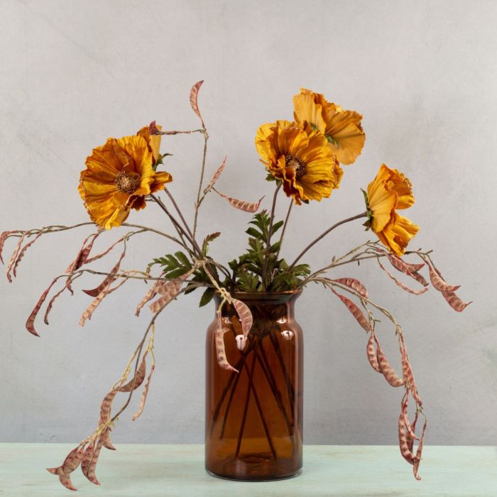 Sametově jemné a zářivě krásné! Vytvořit podzimní náladu zde byla hračka, protože odstín oranžovo-zlatého máku se k žádnému jinému ročnímu období nehodí lépe. Jak sametově měkký vypadá, tak působí i na dotek a vytvoří ve vašem domově hřejivou náladu. Tmavě červené hrachové lusky mírně zjemňují majestátní vzhled zlatých máků a v kombinaci s hnědou vázou vytvářejí nádherný jednobarevný vzhled. Vneste do svého domova záři podzimu! Nakupte si tento vzhled!Designový tip: Toto aranžmá vynikne obzvlášť dobře, když ho postavíte na tlumeně barevné pozadí. Vhodné jsou zejména jemné odstíny šedé, modré nebo mátové. Ale také tmavé stěny, jako je fialová nebo černá, dobře zvýrazní jasné barvy a navodí podzimní náladu. Upravte 5 makovic do stejné délky na váze. Doplňky mohou být různě vysoké.