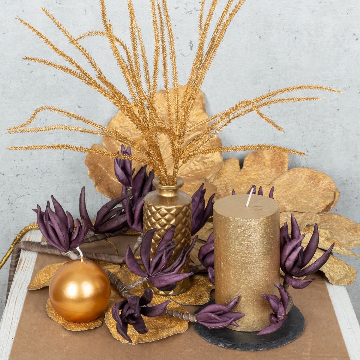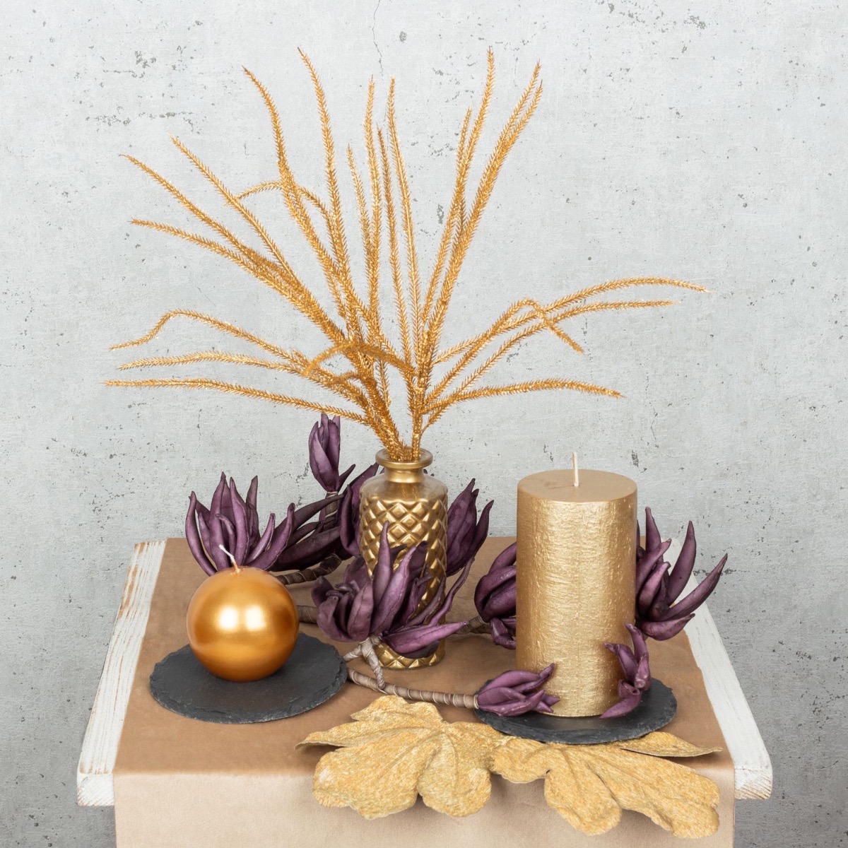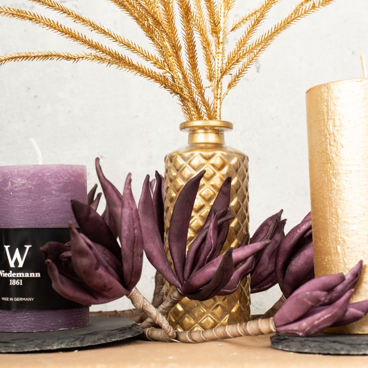 Fialová a zlatá! Atmosférická barevná kombinace, která se hodí zejména v zimě. Když je venku zima, chcete do svého domova vnést teplo. Teplé zlaté tóny jsou zde obzvláště vhodné, protože zároveň vytvářejí slavnostní atmosféru pro nadcházející vánoční období. Umělé pěnové květy fialové barvy vynikají mezi dekoracemi na stole a hrají kolem zlatých prvků na stole. Okouzlete své hosty touto nádhernou dekorací. Nakupte si tento vzhled!