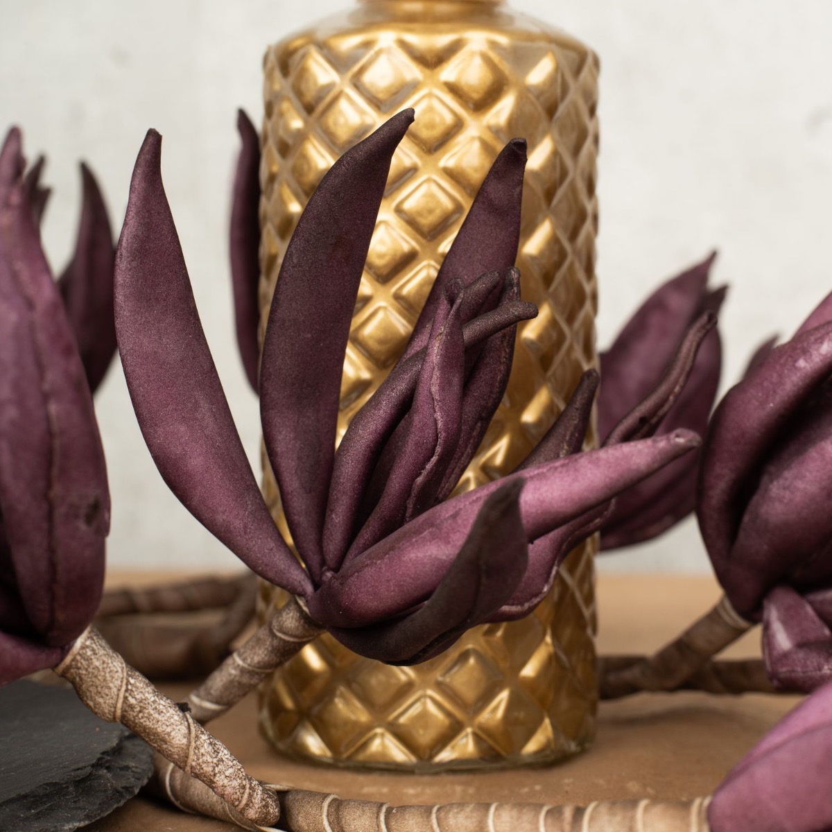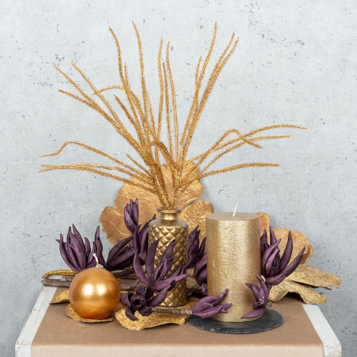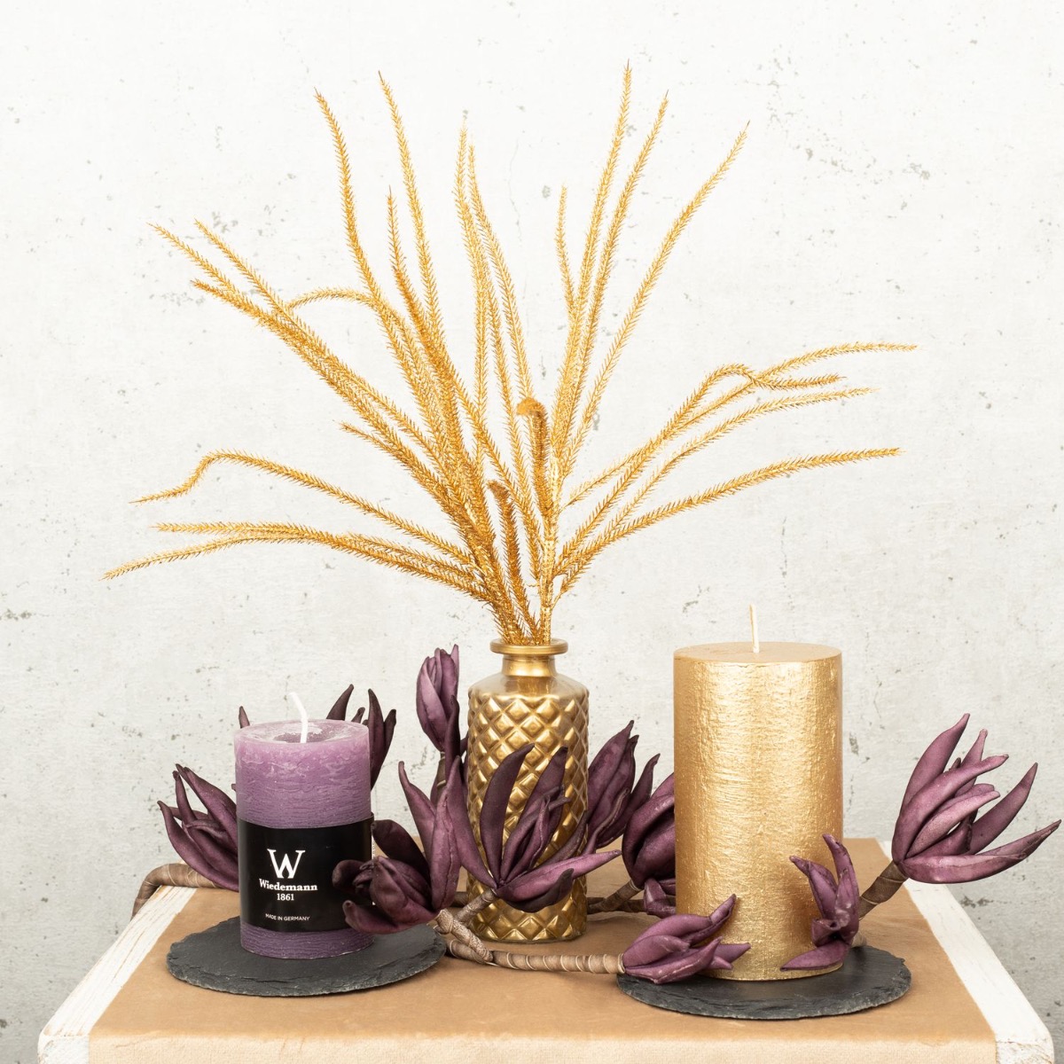 Fialová a zlatá! Atmosférická barevná kombinace, která se hodí zejména v zimě. Když je venku zima, chcete do svého domova vnést teplo. Teplé zlaté tóny jsou zde obzvláště vhodné, protože zároveň vytvářejí slavnostní atmosféru pro nadcházející vánoční období. Umělé pěnové květy fialové barvy vynikají mezi dekoracemi na stole a hrají kolem zlatých prvků na stole. Okouzlete své hosty touto nádhernou dekorací. Nakupte si tento vzhled!
