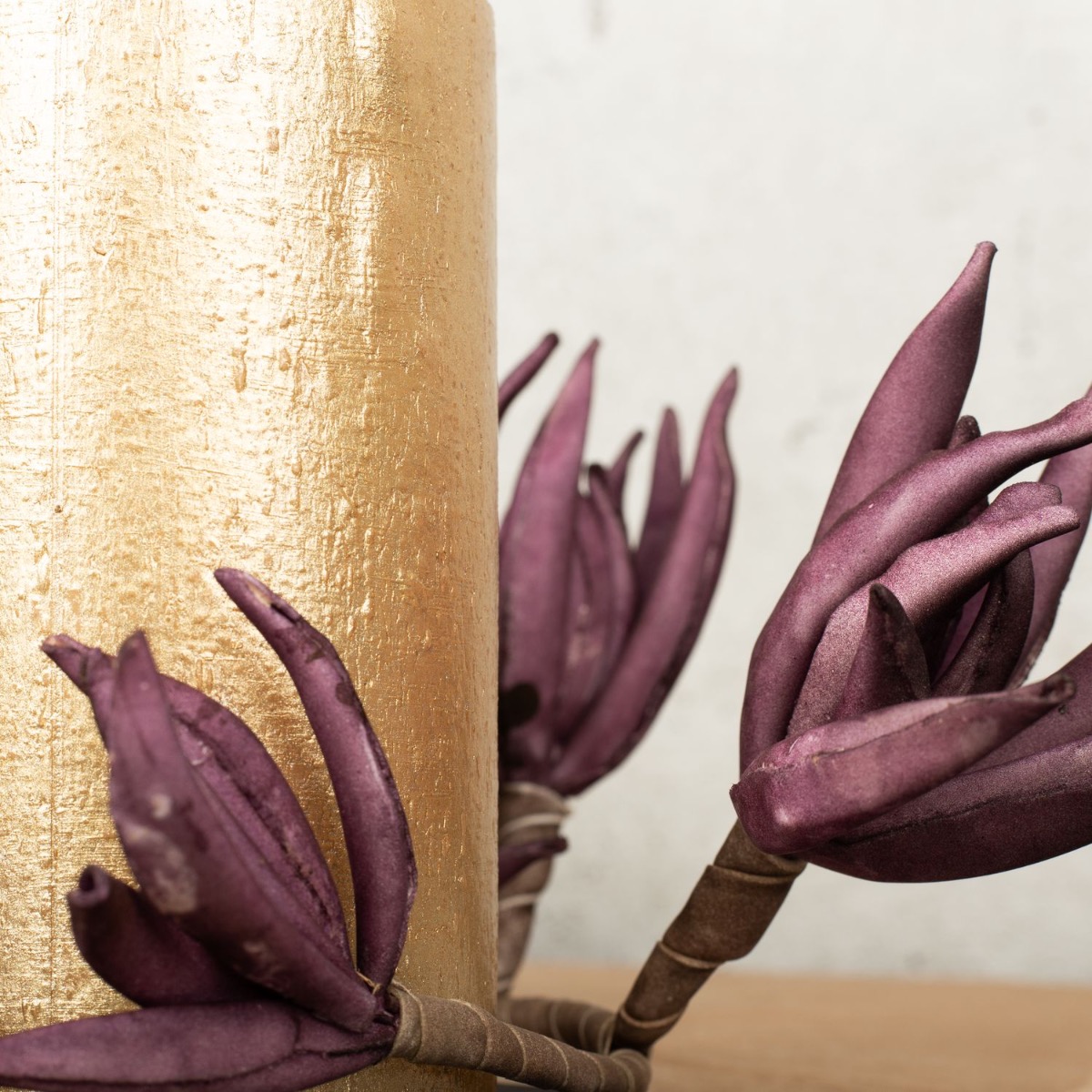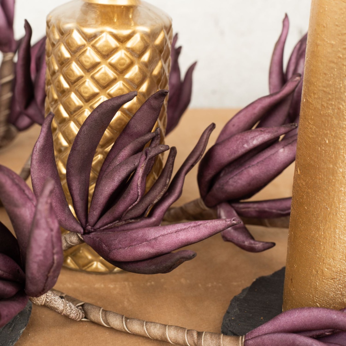 Designový tip: Zlatý fíkový list byl na stůl umístěn jako první. Některé listy slouží jako podstavec pro svíčky a vázy. Listy můžete také odstranit ze stonku, abyste si usnadnili design. Větvička fialových umělých pěnových květů se položí na stůl naplocho a květy se ohnou nahoru. Stonek můžete jednoduše odříznout nebo ohnout kolem dekorativních prvků.
